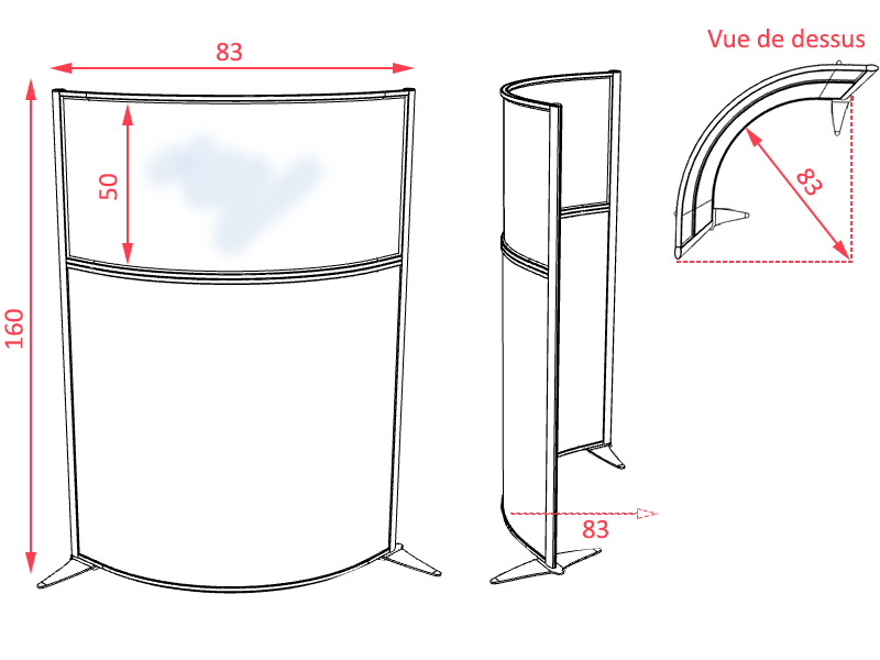 KP+ courbe est disponible en hauteur 160 ou 180 cm et a un encombrement au sol de 83 cm de largeur par 83 cm de profondeur.