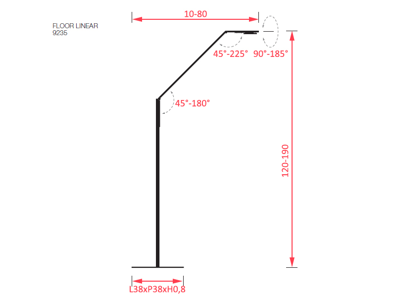 Floor a un bras articulé autobloquant qui se règle en 2 endroits : au dessus de l'écran tactile et au niveau de la tête. La tête du lampadaire pivote à 180° pour créer une lumière indirecte et obtenir une ambiance plus cosy. Floor a une hauteur réglable de 120 à 190 cm et un déploiement de 10 à 70/80 cm, en fonction du modèle.