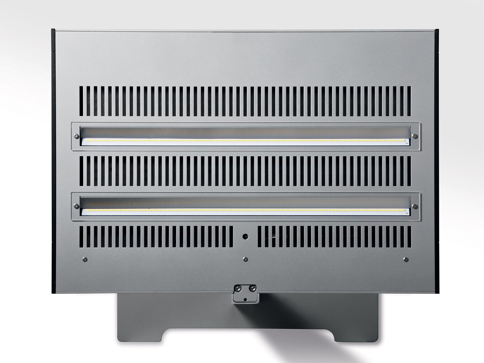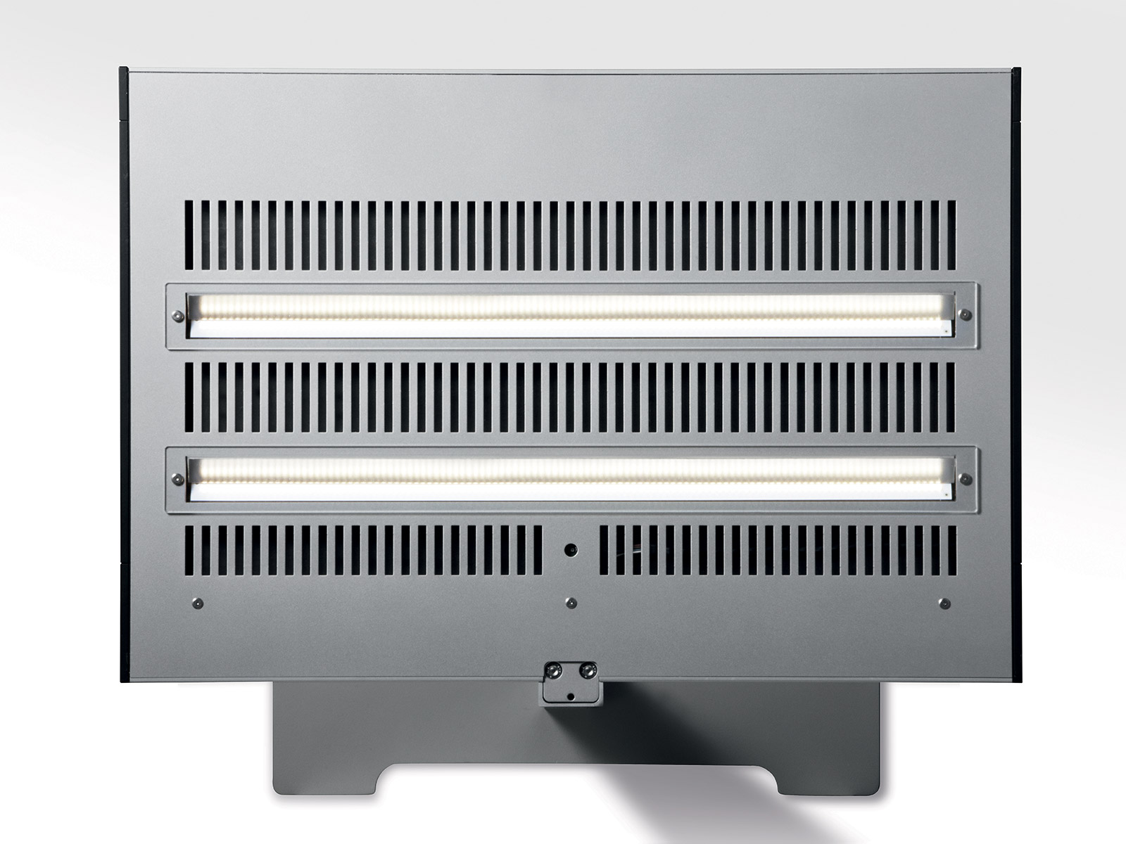 vers le plafond) de manière asymétrique, pour couvrir une plus grande surface de travail particulièrement homogène de toute la zone de travail, tout en consommant peu d'énergie grâce à ses LEDs. Cette version a une puissance de 7000 lumens et couvre environ 10m², soit un poste.
