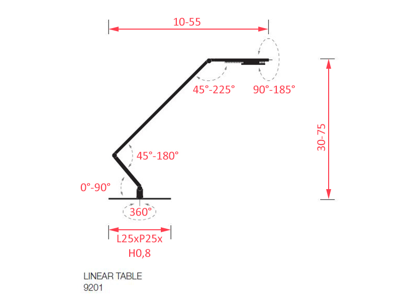 Table a un bras articulé autobloquant qui se règle en 2 endroits : au dessus de l'écran tactile et au niveau de la tête. La lampe pivote à 360° sur sa base, la tête pivote à 180° pour créer une lumière indirecte et obtenir une ambiance plus cosy. La lampe a une hauteur réglable de 30 à 75 cm et un déploiement de 10 à 55 cm.
