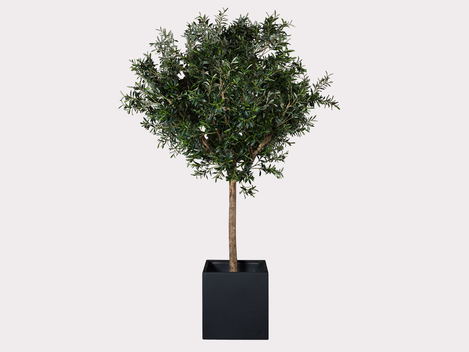 L'olivier est composé d’un tronc avec 3 branches principales garnies de feuilles et d'olives artificielles. Sa base est habillée d’écorces de pin, pour une finition naturelle impeccable. Il est assemblé en France dans son pot en fiberstone noir ou blanc. Le pot peut être modifié, sur demande.