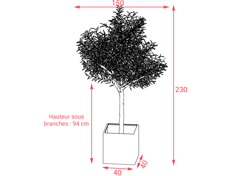 Dimensions : H 230 cm, envergure 150 cm, hauteur sous branches 94 cm.