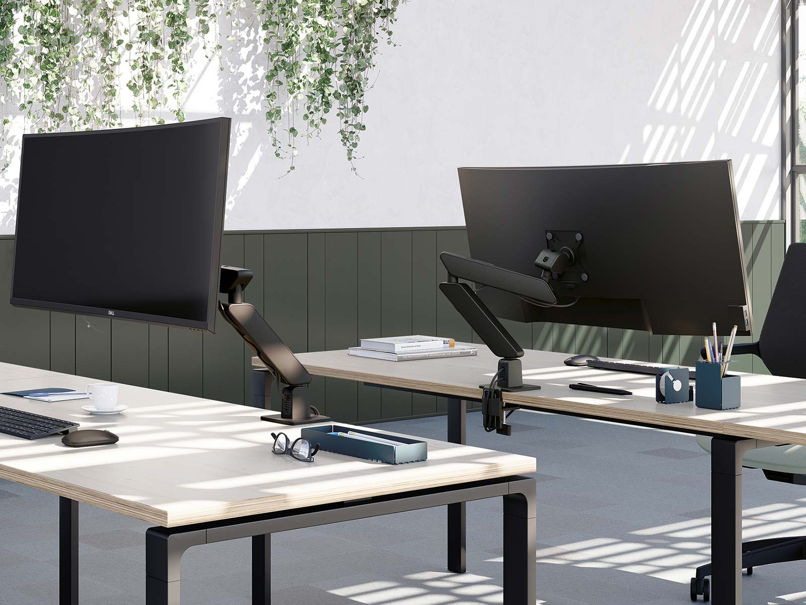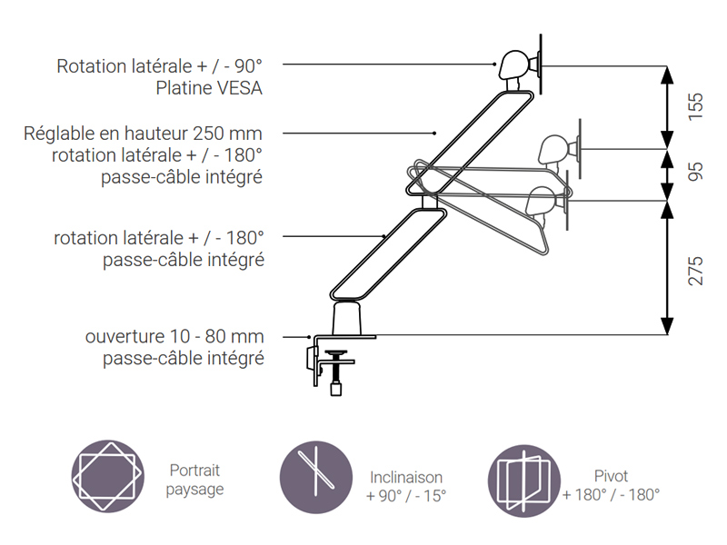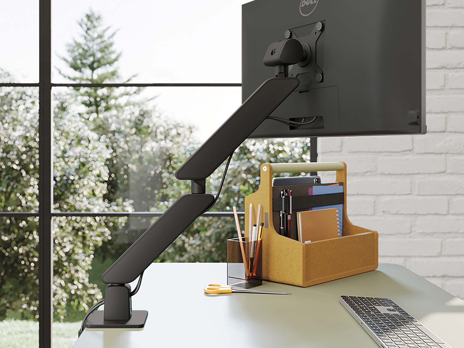 Le bras est disponible en coloris blanc ou noir. Il se fixe via une pince qui pourra s'adapter sur les plans de travail d'une épaisseur de 15 à 40 mm maximum. Il pourra recevoir un écran d'une t'aille maximale de 34 pouces et d'un poids maximal de 9 kg.