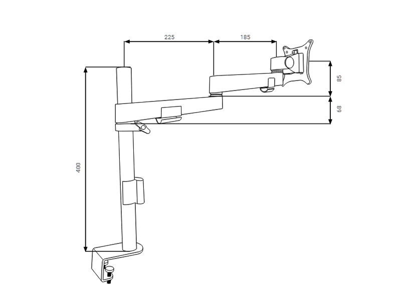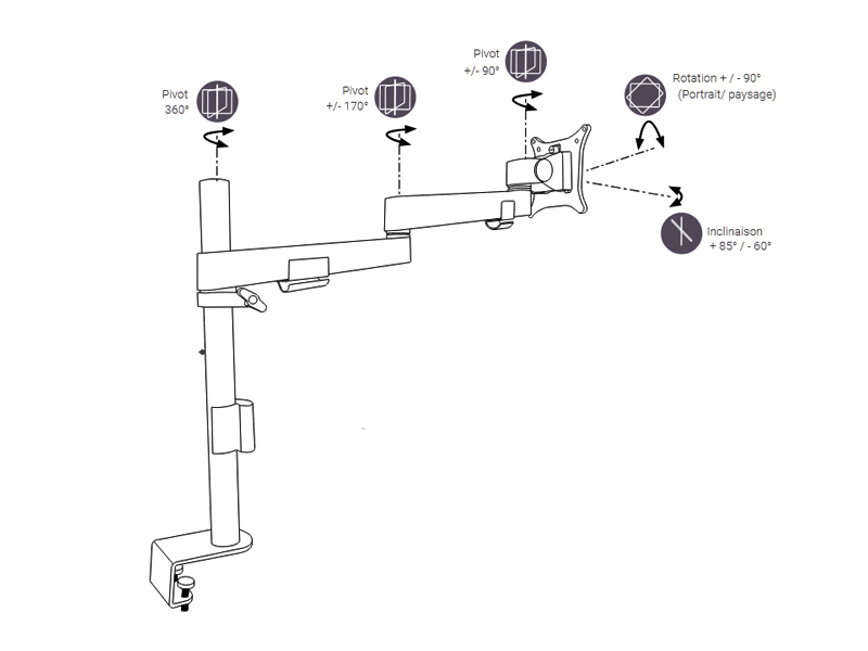 Le bras se fixe via une pince qui pourra s'adapter sur les plans de travail d'une épaisseur de 15 à 40 mm maximum. Il pourra recevoir un écran d'une t'aille maximale de 30 pouces et d'un poids maximal de 9 kg.
