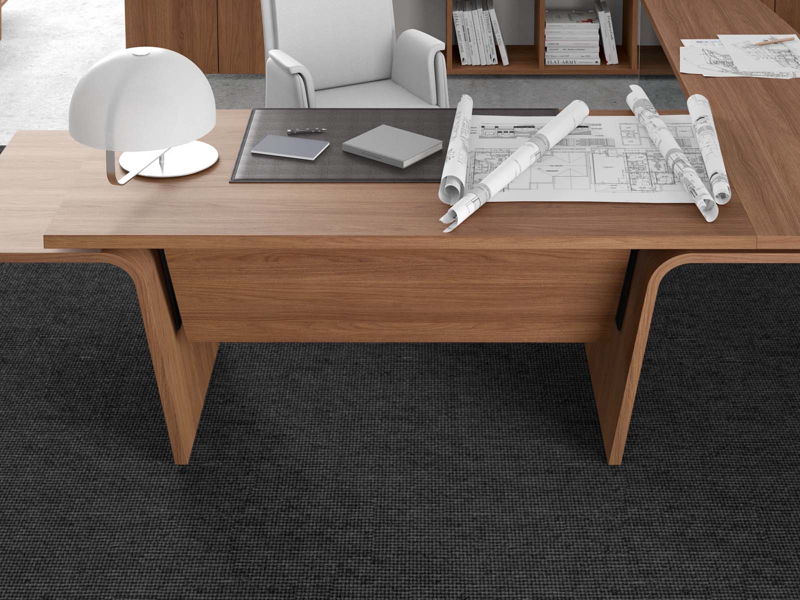 Della Rovere propose d'ajouter un voile de fond à son bureau Larus afin de gagner en intimité. En effet, ce panneau en bois mélaminé occulte tout ou partie de l'espace visible sous le plateau et donc les jambes.