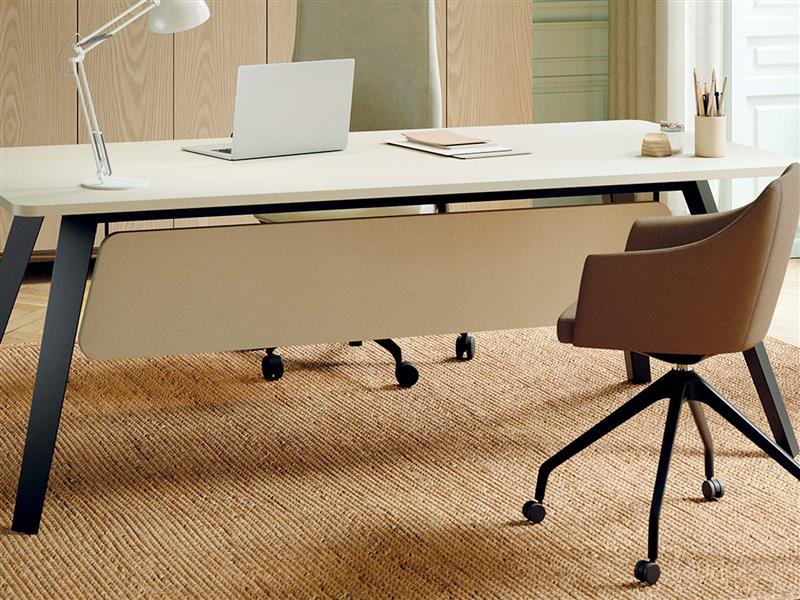 Le voile de fond en bois mélaminé d’une épaisseur de 19 mm, disponible en 9 coloris, apporte à la fois élégance et robustesse à votre bureau. Outre son esthétique réussie, il permet de dissimuler l'espace sous le bureau à vos visiteurs.