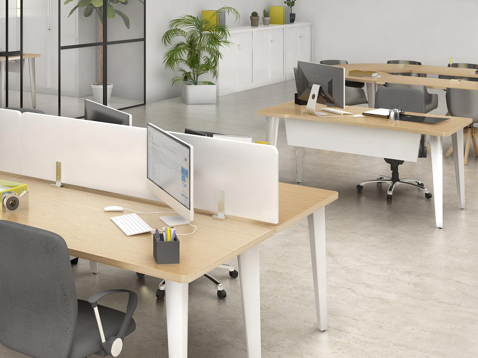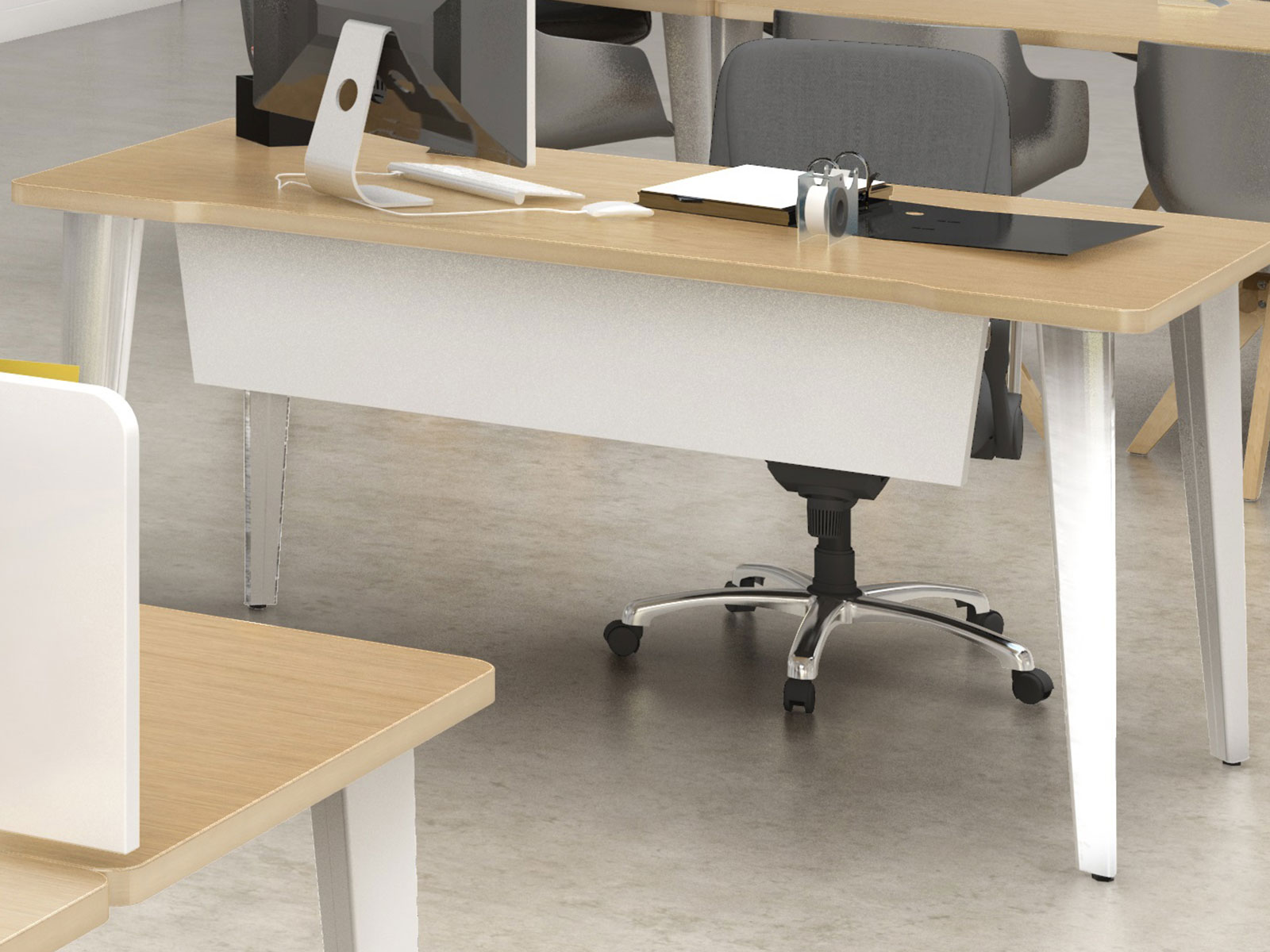 Le voile de fond est en tôle d’acier d'épaisseur 10/10ème. Il a les mêmes finitions que les piètements des bureaux : blanc RAL 9010, gris aluminium RAL 9006 et anthracite RAL 7016.