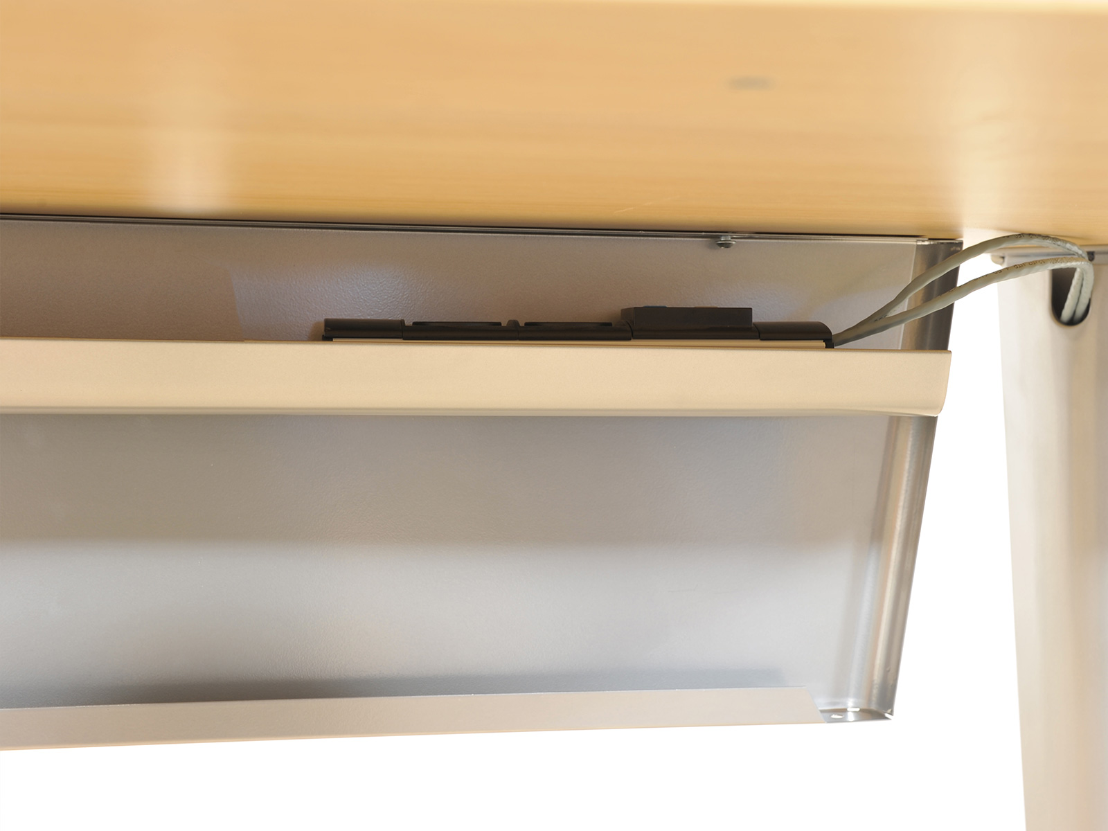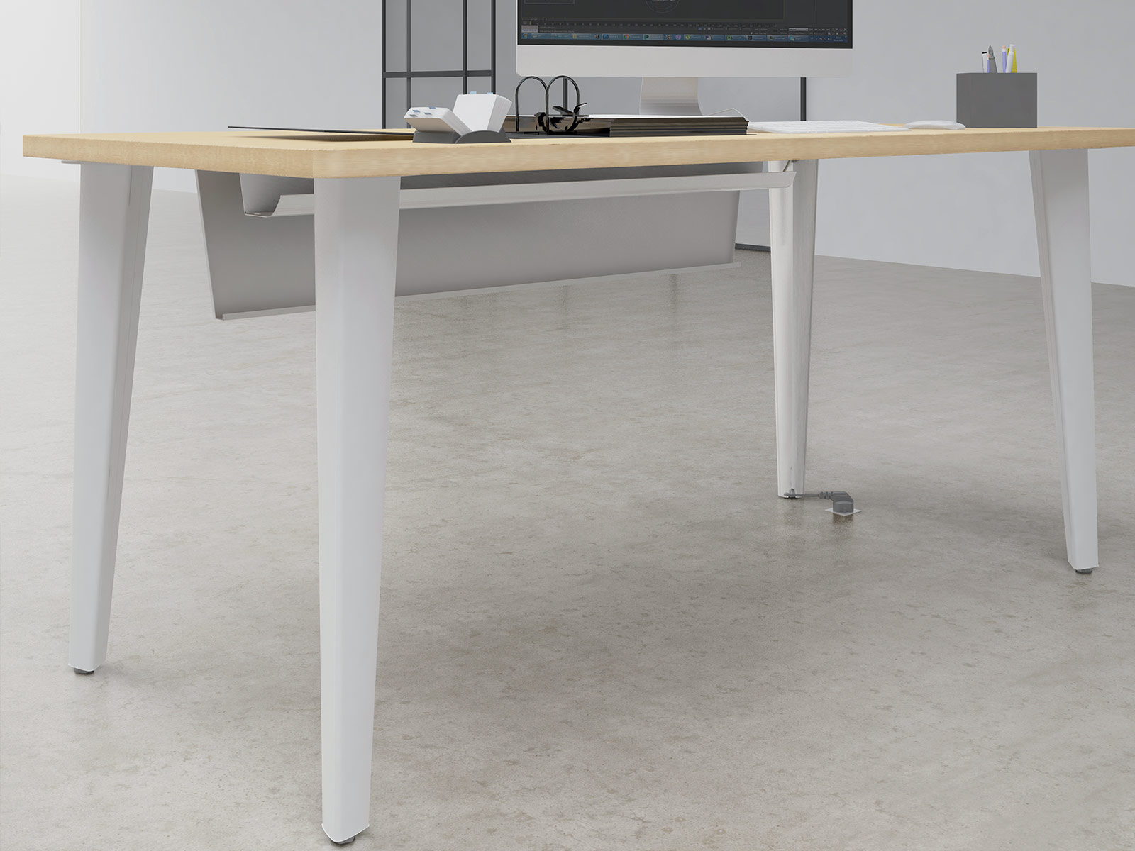 Ce voile de fond métallique pour bureaux Evidence de la marque Vinco apporte un élément de confort et de design à la gamme. Parfaitement compatible avec la goulotte des bureaux Evidence, sa fixation par vis permet de cacher totalement la goulotte et l’électrification horizontale du poste de travail, ainsi qu'une partie des jambes de l'utilisateur.
