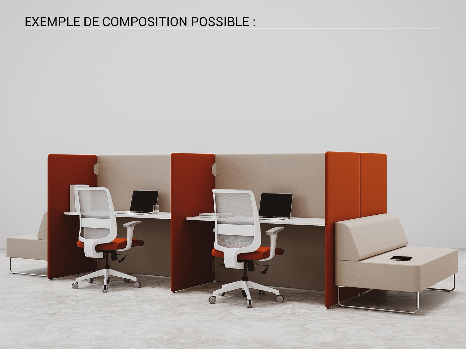 La collection Plug permet de créer des espaces de travail individuels délimités par des cloisons, offrant ainsi un environnement plus agréable et plus serein. Nous vous proposons ici un poste de travail seul mais Plug est un système de panneaux modulaires qui permet la construction de plusieurs dispositions comme vous pouvez le voir sur les photos "exemple de composition". Cela vous permet de créer un ensemble répondant parfaitement à vos besoins.