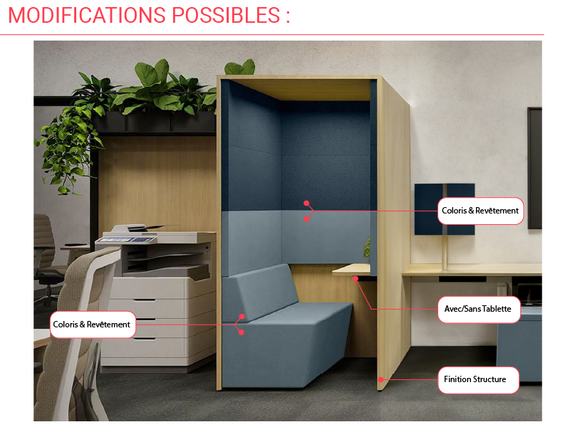 L’apparence sobre et rectangulaire de l’alcôve acoustique Close par Dinavi s’intègre dans tous les environnements d’entreprises allant de l’espace d’accueil à l’open space. Ce style de mobilier est prisé pour sa capacité à créer rapidement un espace privé — une pièce dans une pièce — où il est bon de travailler au calme lors de journées agitées. Ici, l’alcôve est une invitation au bien-être, sa base en bois ajoute une touche chaleureuse pendant que son revêtement intérieur ajoute du peps avec les couleurs proposées. L’ensemble est tapissé de panneaux acoustiques de 48 mm d'épaisseur entourant l'utilisateur et permettant d'absorber efficacement les bruits environnants.