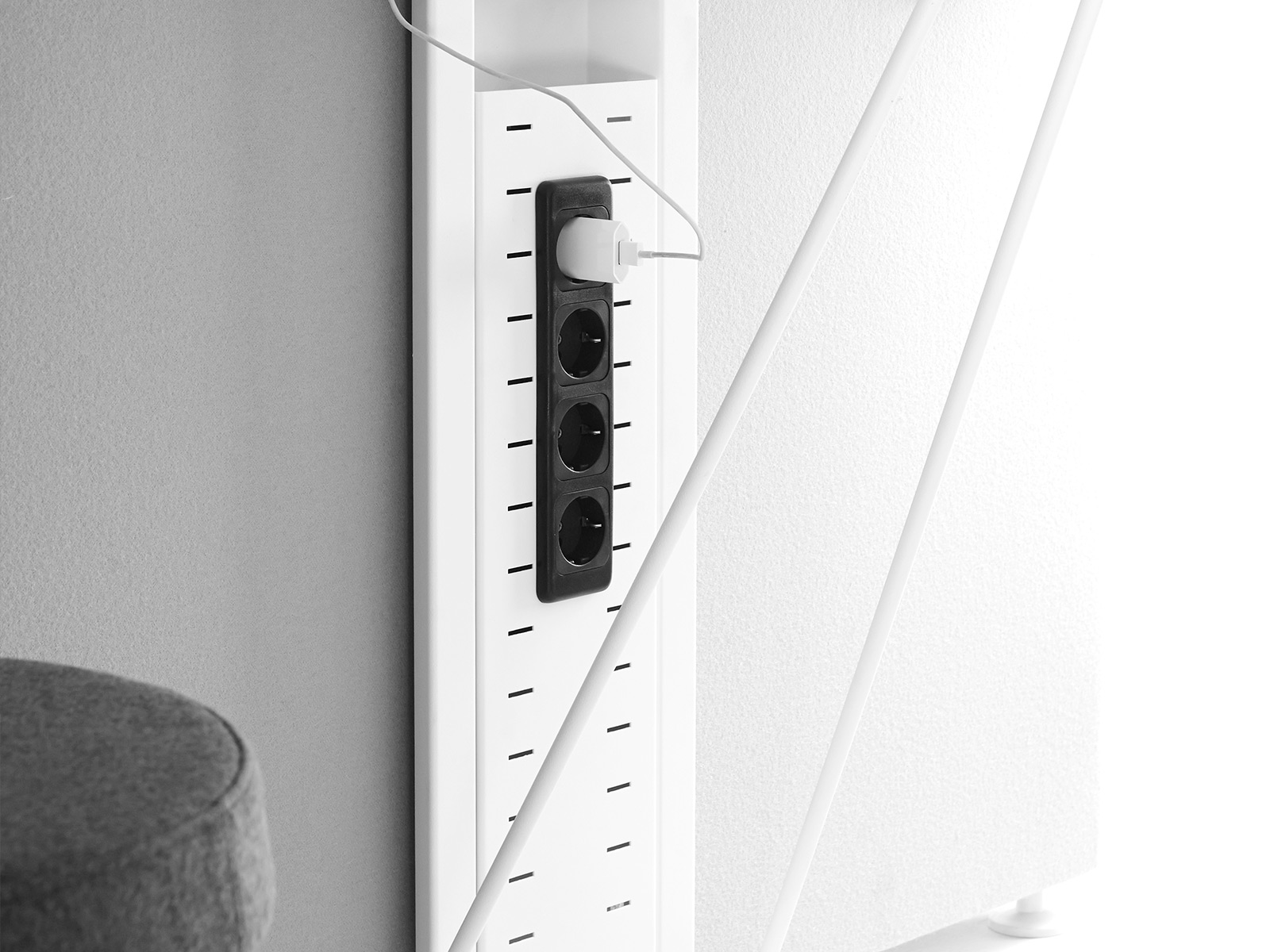 La colonne d'électrification s'insère entre la cloison et la table, qui possède une découpe spéciale pour le passage de la colonne, et permet de faire courir les câbles, accrocher un écran et une nourrice avec prises de courant.