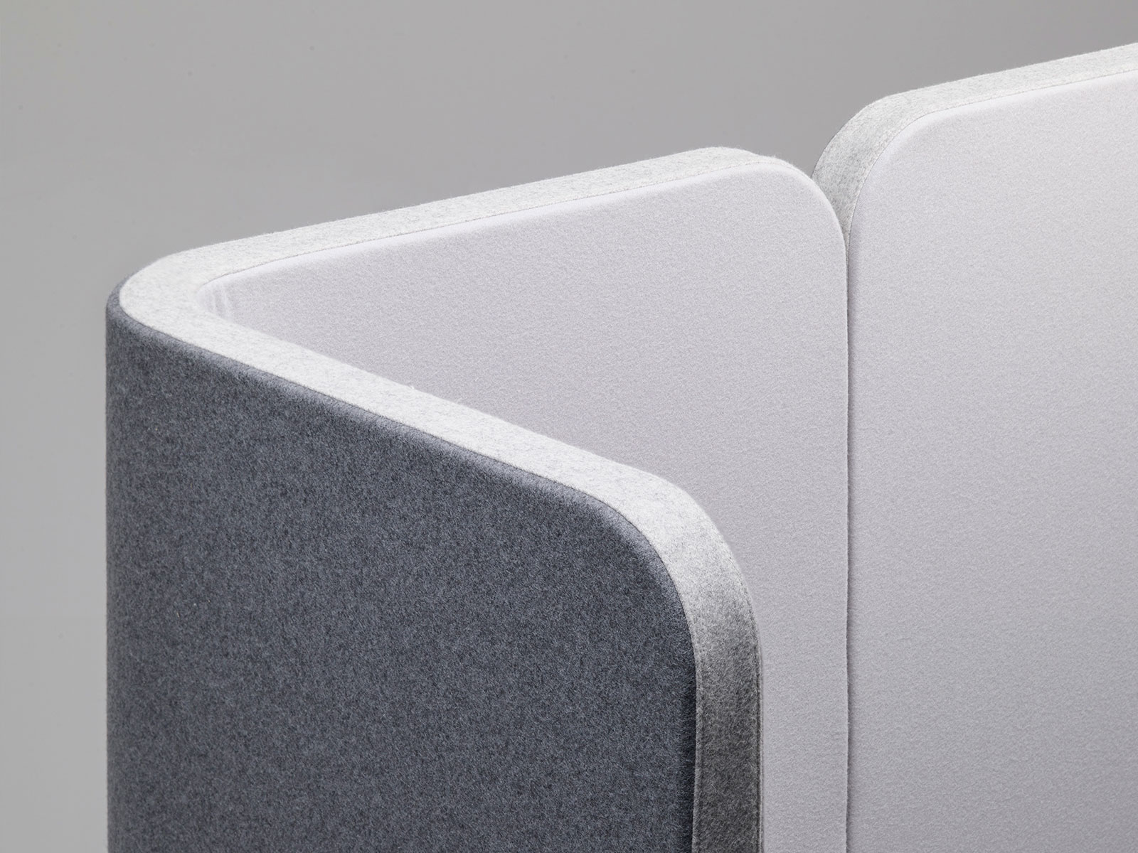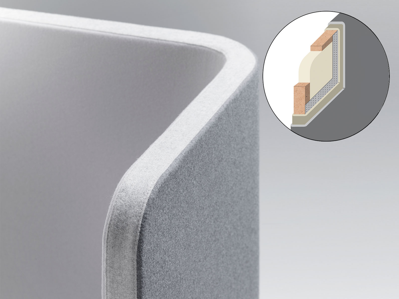 L’habillage des cloisons est composé de 3 pièces de tissu : en partie interne, externe, et sur le pourtour. Un simple système de fixations mâle-femelle assure leur union, avec un gain de temps sur l'installation. Les cloisons d'angles sont arrondies pour plus d'esthétisme et mieux étouffer les sons.