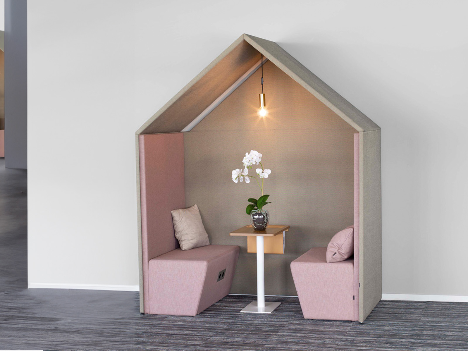 D’une grande flexibilité, l’alcôve acoustique Hut Half permet de l’équiper d’accessoires. Ainsi, on trouvera de l’éclairage LED, mais également des coussins, plantes artificielles, tablettes et des prises de courant sous les sièges pour des réunions conviviales et chaleureuses. De plus, on apprécie le passage interne des câbles afin de parfaire l’intégration des luminaires.