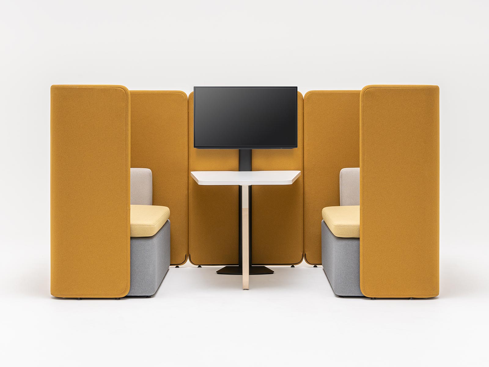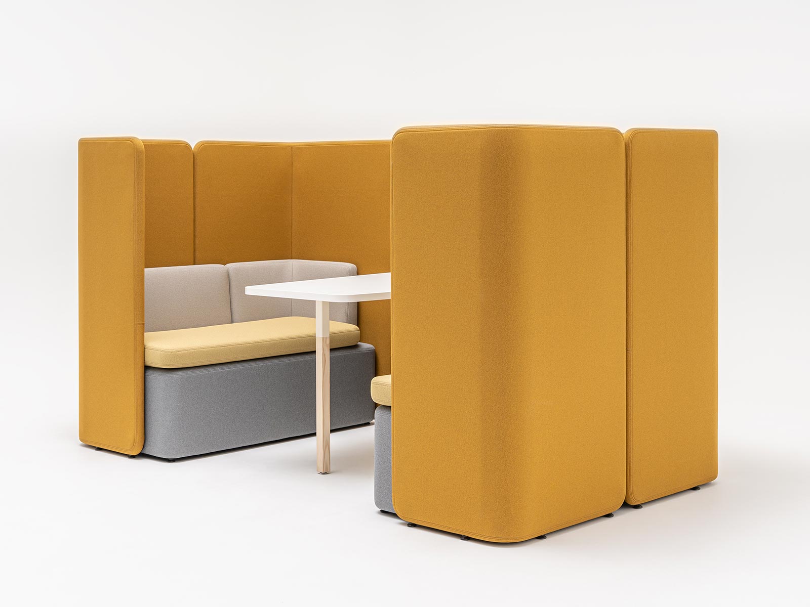 L'objectif de Kaiva est de créer un espace de réunion semi-privé. Entouré de hauts panneaux de bois tapissés qui isolent du bruit de l'environnement extérieur, cet espace devient une bulle acoustique pour les conversations et le travail d'équipe. Les utilisateurs profitent d’un lieu propice à la concentration, que ce soit pour des échanges ou des tâches à effectuer.