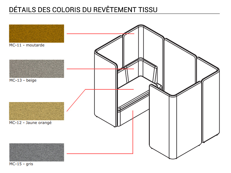 D'autres revêtements de tissu sont disponibles pour la cloison et les banquettes et d'autres finitions sont possibles pour le plan en mélaminé de la table. N'hésitez pas à nous contacter pour plus d'informations sur les possibilités de personnalisation.