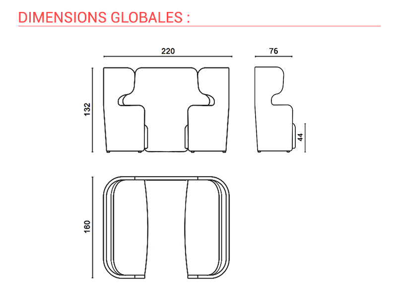 Les canapés deux places mesurent 157 cm de large, 76 cm de profondeur et 133 cm de hauteur, avec une assise à 44 cm du sol. Quant à la table trapézoïdale, elle fait 65 cm de profond au point le plus large, 55 cm au point le moins large, sa longueur est de 115 cm, avec une hauteur de 68 cm. La petite table centrale de forme trapèze pourra être commandée avec l'alcôve ou non, selon vos besoins. Le plateau en mélaminé imitation chêne est soutenu par une structure en acier blanc, également disponible en noir et en blanc pour le plateau et en noir pour la structure.
