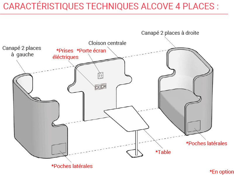 La cloison centrale pourra être équipée de prises électriques et d'un port USB. En options supplémentaires, vous pouvez ajouter un support écran et des poches de rangement latérales.