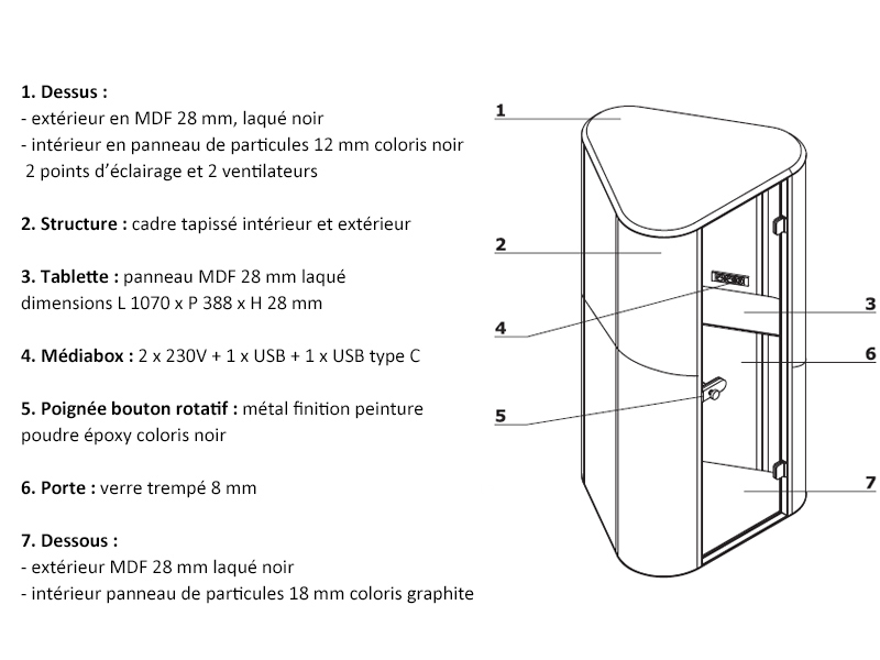 A l'intérieur, vous disposerez d'une petite tablette pour poser votre téléphone ou un carnet de note par exemple. Une médiabox est également intégrée et vous offrira 2 prises de courant et 2 prises USB.