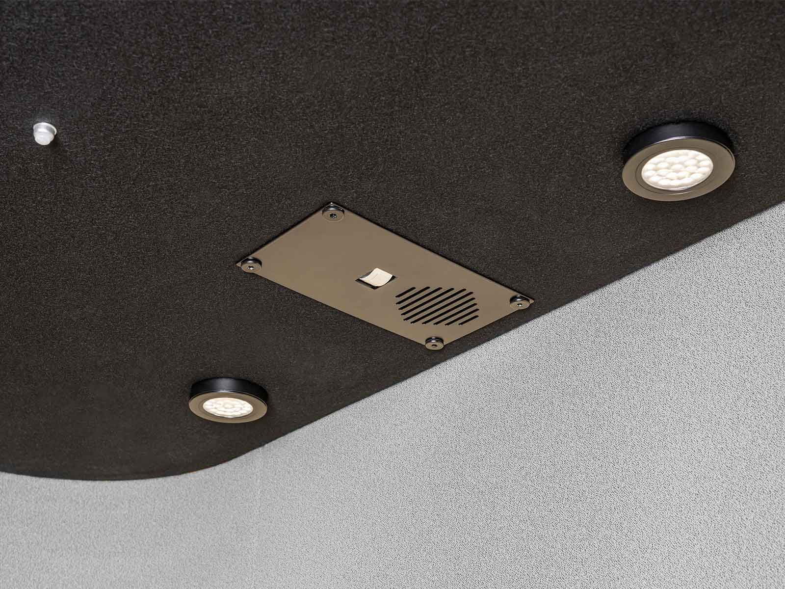 En terme d'acoustique, les parois sont fabriquées avec la technologie des écrans acoustiques Sonic de classe A. Des matériaux de rembourrage insonorisant sont disposés à l'intérieur et à l'extérieur de la cabine.