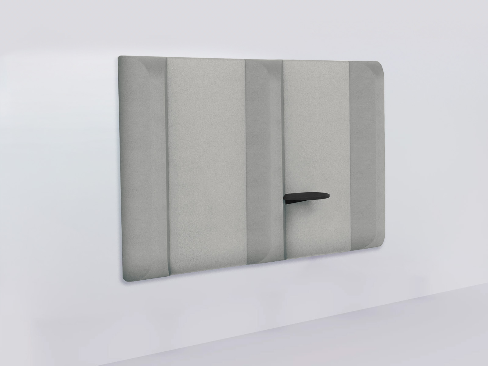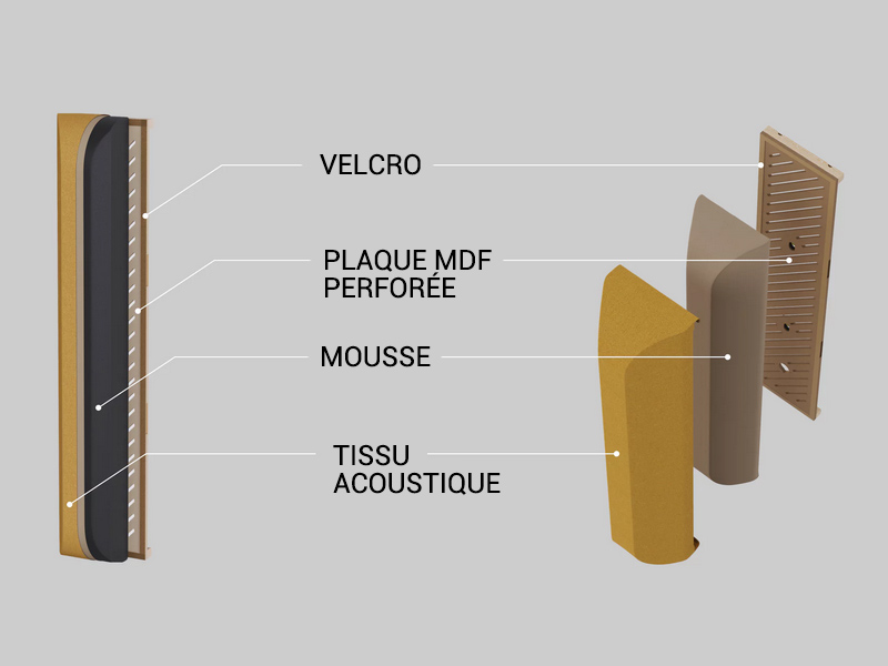 panneau MDF perforé, d’un rembourrage en mousse et d’un tissu acoustique. L’assemblage est assuré par une bande velcro, garantissant une installation simple et modulable. Pour plus de confort, Intuit propose en option des