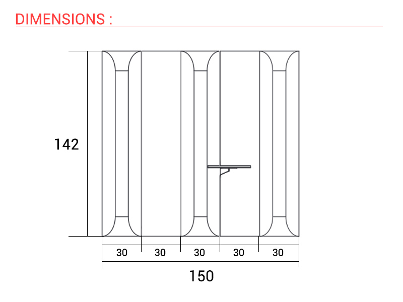 L'ensemble présenté ici se compose de 5 modules installés les uns à côtés des autres : 2 modules droits et 3 modules d'angles dont 1 avec tablette.