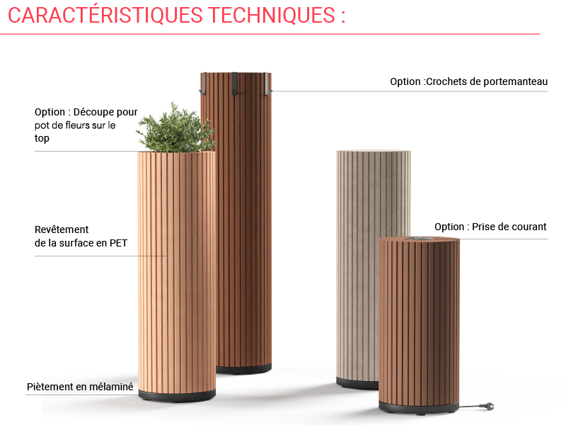 bacs à fleurs en PET valable pour toutes les dimensions. Enfin, le totem acoustique Parcell est certifié selon la norme de qualité
