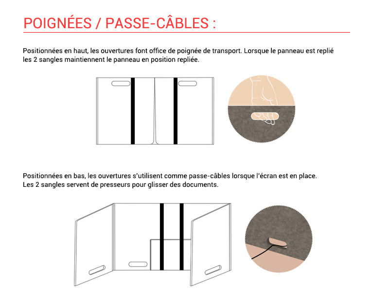 passage des câbles mais aussi pour transporter le panneau. Dans l'optique de déplacement, le panneau pourra être replié et les rabats pourront être verrouillés avec des sangles.