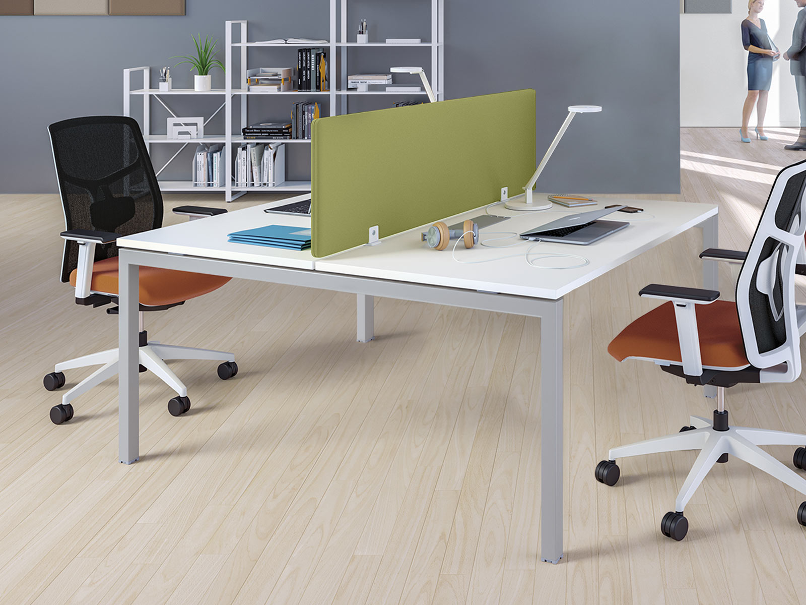 En ajoutant un panneau séparatif central entre les plateaux, vous permettez à chaque utilisateur d'avoir son propre espace de travail délimité, sans vue direct sur sa zone de travail. De plus, certains accessoires pour les fournitures pouvant se fixer sur les panneaux permettent de dégager le plan (pot à crayons, bac à courrier, etc.). L'ajout de panneaux aux propriétés acoustiques contribue à baisser le bruit de votre pièce et de mieux les absorber par rapport à des panneaux en bois ou en verre (voir configurateur).