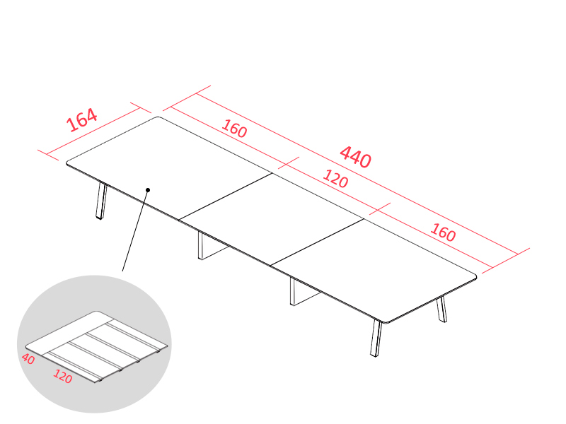 Cet ensemble dispose de plateau en bois mélaminé de 18 mm d'épaisseur. Chaque ensemble face à face dispose d'un plan unique (donc 3 plans en tout). Les plans de travail dépassent de la structure de 40 cm sur les côtés, ce qui permet d'offrir un petit espace supplémentaire pour les réunions informelles ou d'insérer un caisson SLIM qui ne gênera les jambes.