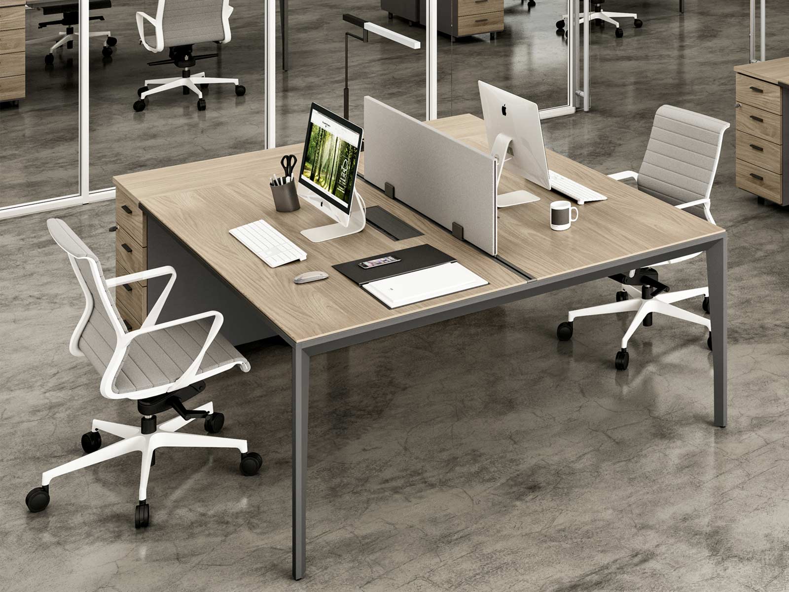 L'Oméga est un bureau bench pour 2 personnes composé d'un piètement profilé et élégant. Les caissons à la hauteur du plan de travail permettent aux 2 utilisateurs de bénéficier d'un espace de rangement fort pratique et facile d'accès. Leur positionnement (gauche ou droite) se décide lors du montage.