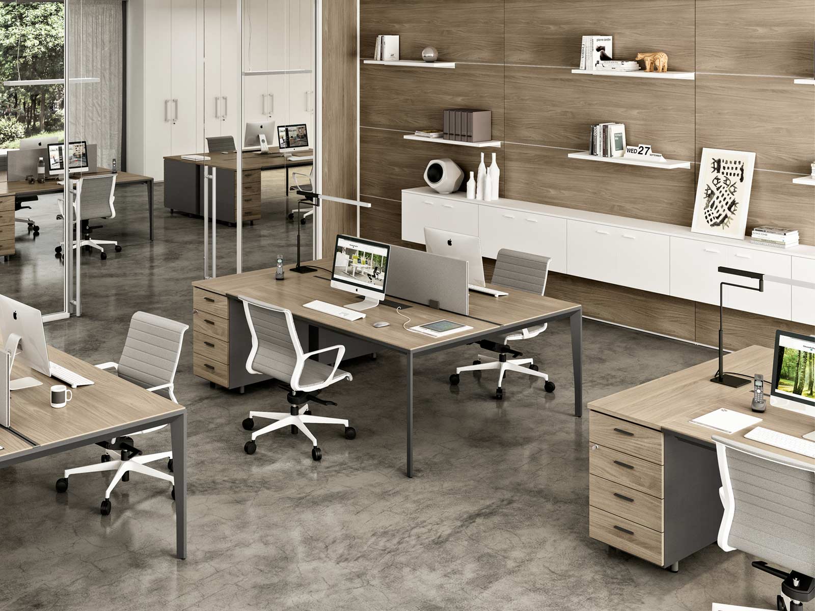Etner propose d'ajouter en option des top access sur les plans de travail pour faciliter le passage des câbles et une grille passe-câbles pour le maintien des fils et des multiprises. Une cloisonnette peut être fixée sur le rail central et les 4 tiroirs de chaque caisson peuvent être équipés d'une fermeture soft en supplément.