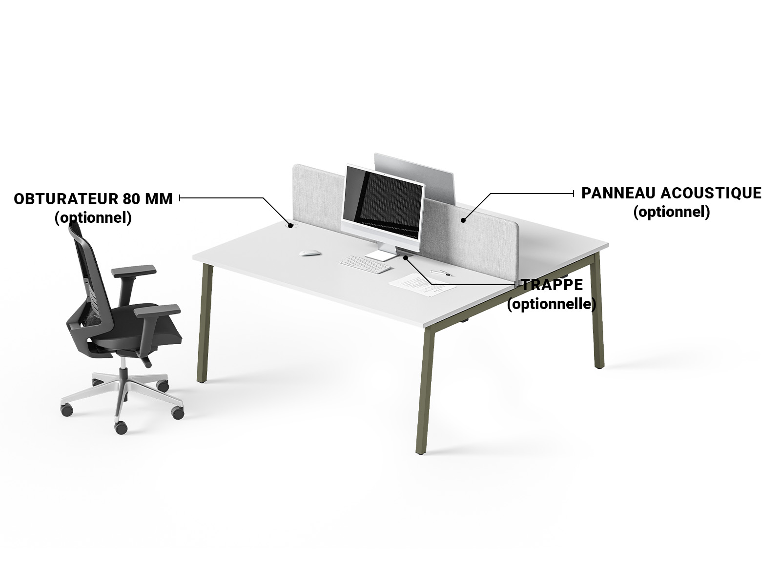 - Possibilité d'ajouter des panneaux de séparation acoustiques (finition textile, verre ou mélaminé) pour améliorer la concentration en open space.