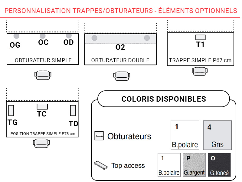 - Passage de câbles : Options d'obturateurs, trappes et goulottes (polypropylène, métal ou extensible) pour dissimuler les flux électriques.