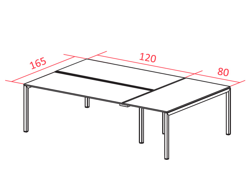 Les 3 plans de travail sont en bois mélaminé d'épaisseur 18 mm et situés à une hauteur de 74 cm. Les 2 plans en face à face sont disponibles en 120, 140 ou 160 cm de largeur pour 80 cm de profondeur. Le 3ème plan, en bout du bureau, mesure toujours 165 cm de largeur pour 80 cm de profondeur.