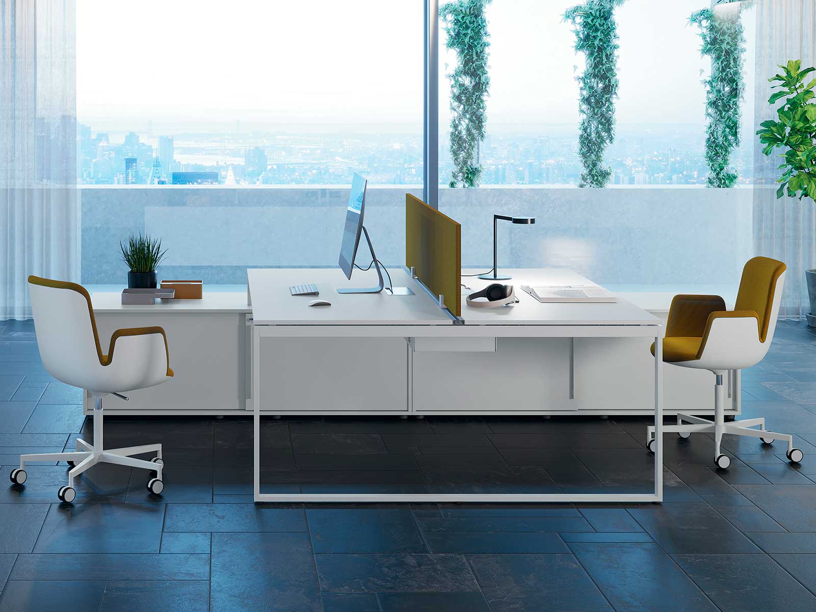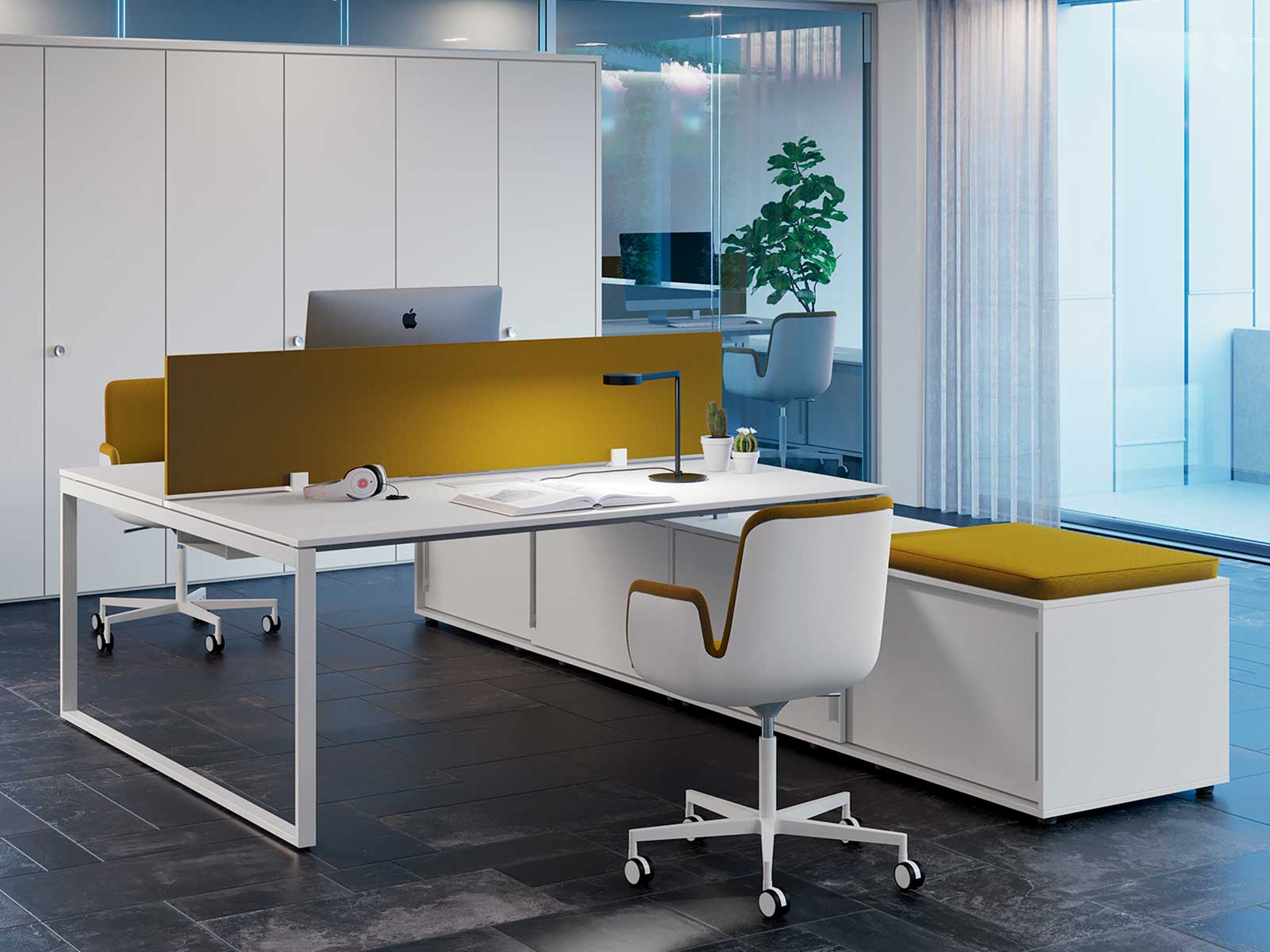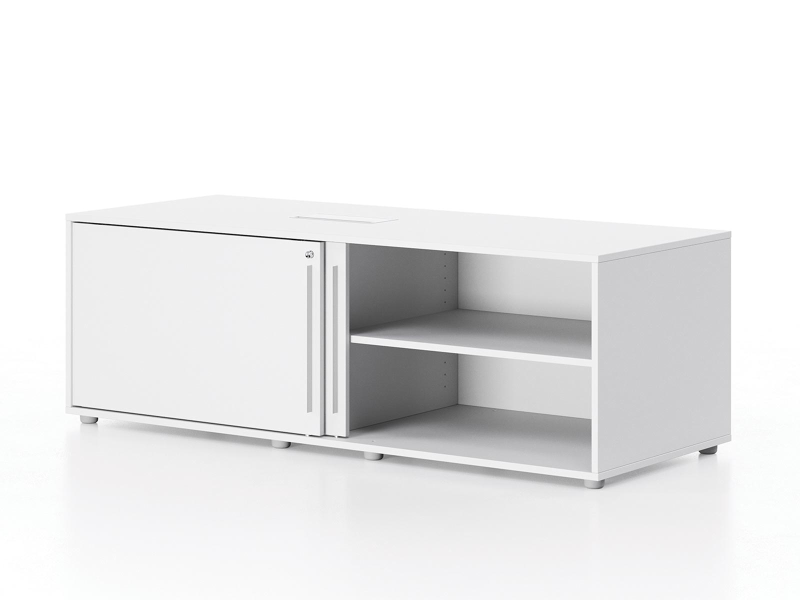 Cet ensemble de travail vous permettra d'accueillir 2 collaborateurs dans des conditions optimales. Chaque poste pourra disposer d'une largeur de 120, 140 ou 160 cm pour une profondeur de 60 ou 80 cm. Des trappes pour le passage des câbles sont disponibles en option. La crédence offrira un rangement de proximité très appréciable. Cette dernière dispose de portes coulissantes, d'une trappe passe-câbles et d'une trappe d'aération pour les unités centrales d'ordinateur. Elle pourra être complétée par une étagère supplémentaire ou un caisson 3 tiroirs qui viendra s'encaster à l'intérieur.