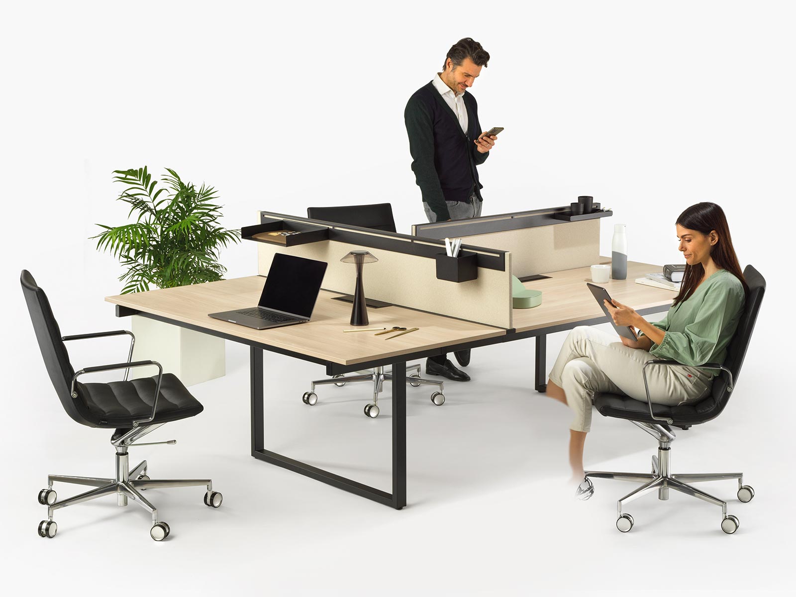 L'un des grands atouts de cette collection est son large piètement de forme cadre en acier qui libère beaucoup de place sous le bureau. Cela permet de moins gêner les utilisateurs au quotidien tout en offrant un aspect visuel plus léger.