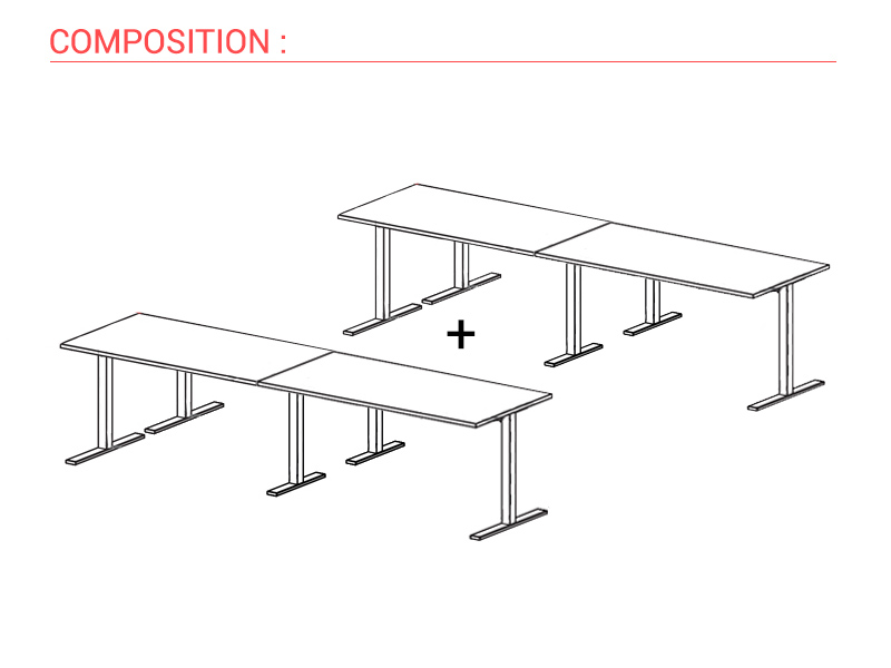 Le plan de travail pourra être complété en option d'obturateurs ou de trappes passe-câbles directement intégrés sur la surface pour le passage des câbles. D'autres accessoires permettront d'obtenir un ensemble de travail plus ergonomique et confortable pour les utilisateurs comme le support écran ou bien les panneaux de séparation en tissu.