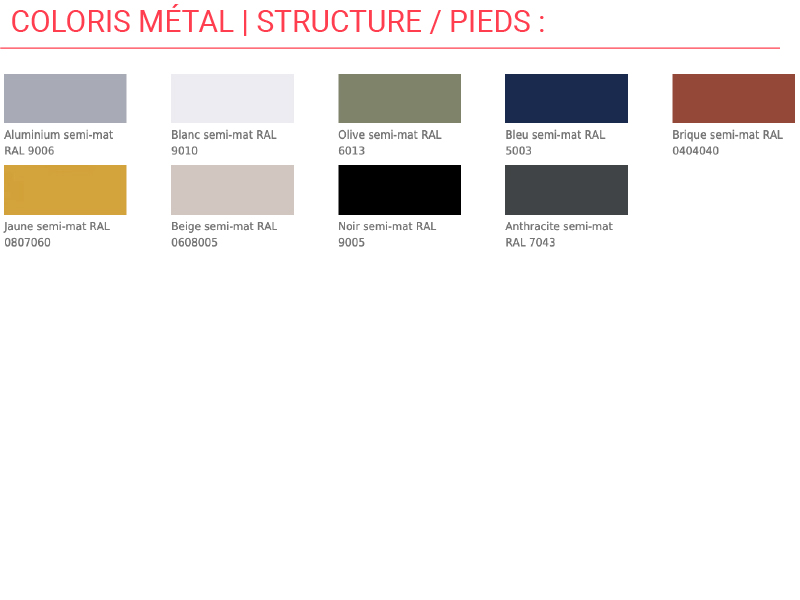 Ce bureau vous est proposé dans un certain nombre de coloris et finitions. Toutes les possibilités ne peuvent être proposées ici, vous avez donc la possibilité de faire vous même votre configuration en contactant notre service commercial. Voici les éléments personnalisables du bureau :