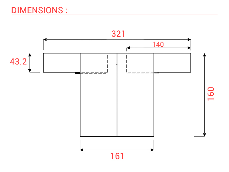 La crédence mesure 140 x 43.2 cm pour 60 cm de hauteur. Elle offre