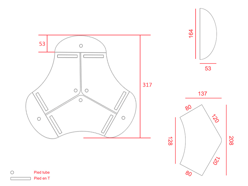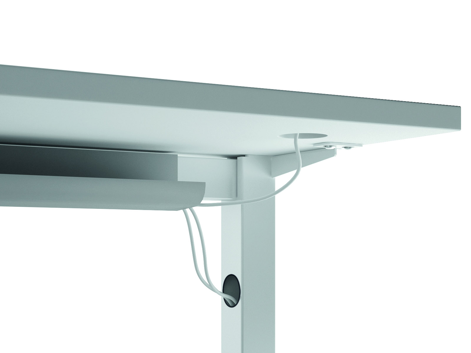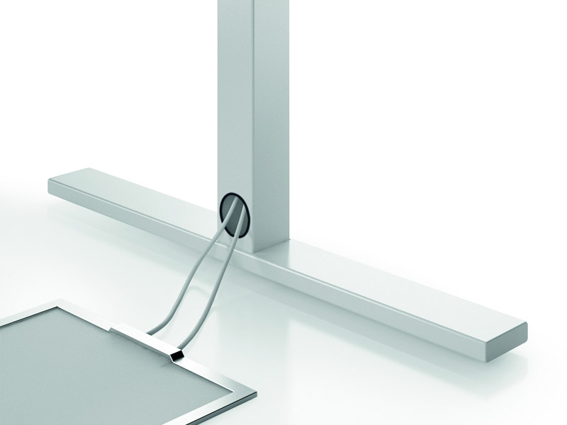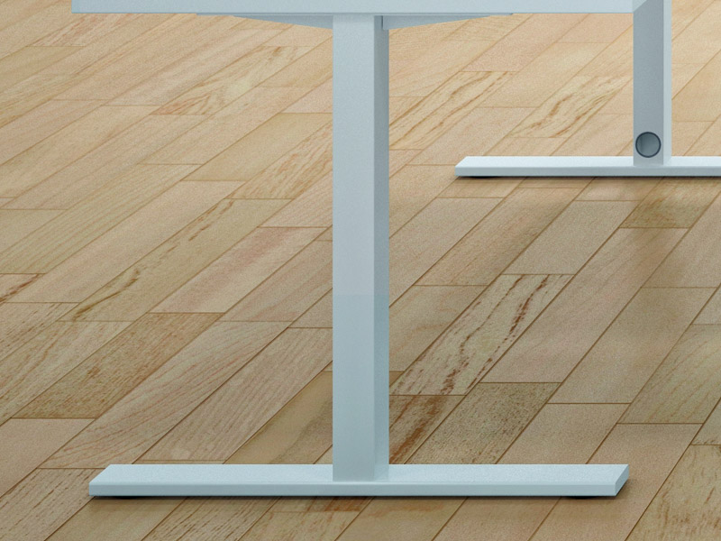 L'ensemble des plateaux est soutenu par six pieds en T avec une descente des câbles intégrée, et des pieds colonne sous les extensions.