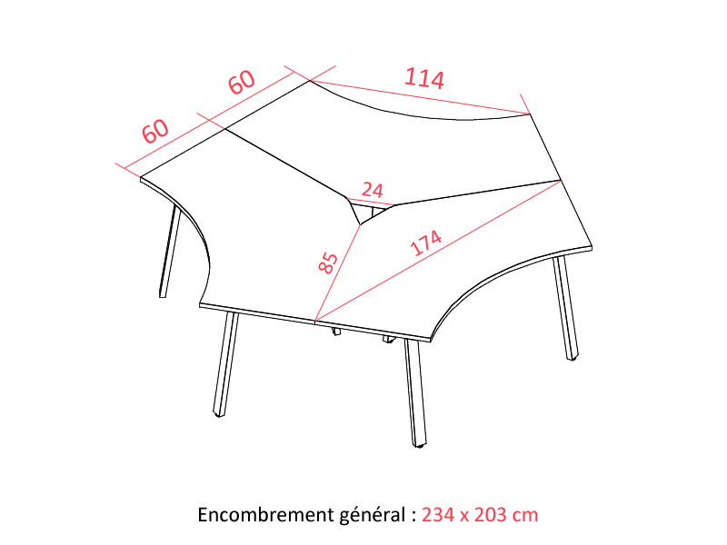 Cet ensemble en étoile de la gamme Ghoja permet de bénéficier de 3 postes de travail pour un encombrement minimal. Un trou est disponible au centre de l'ensemble pour le passage des câbles. Nous conseillons vivement l'acquisition de la
