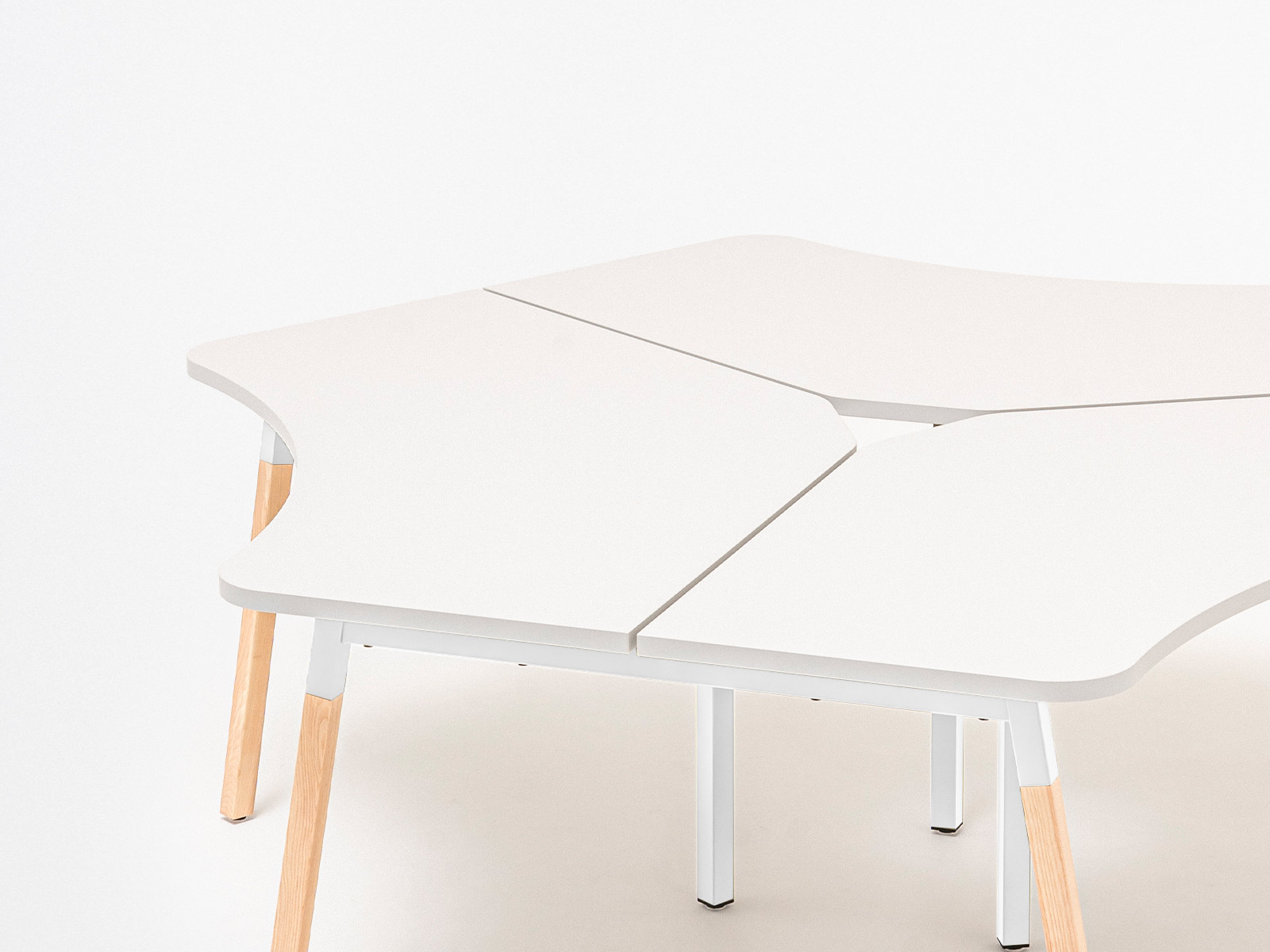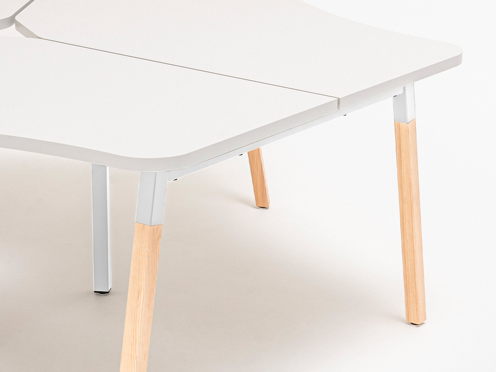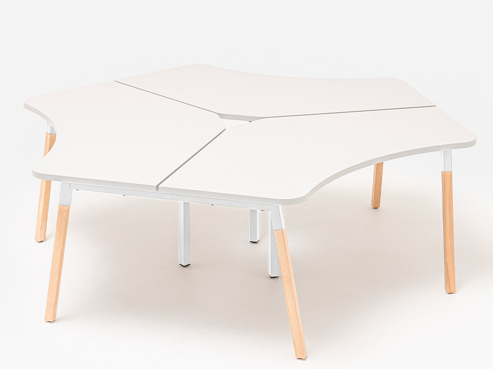 Le plateau de travail, réalisé en mélaminé de 28 mm avec des chants ABS de 2 mm, garantit un excellent rapport qualité-prix. Sa forme arrondie asymétrique optimise l’espace tout en facilitant la collaboration.