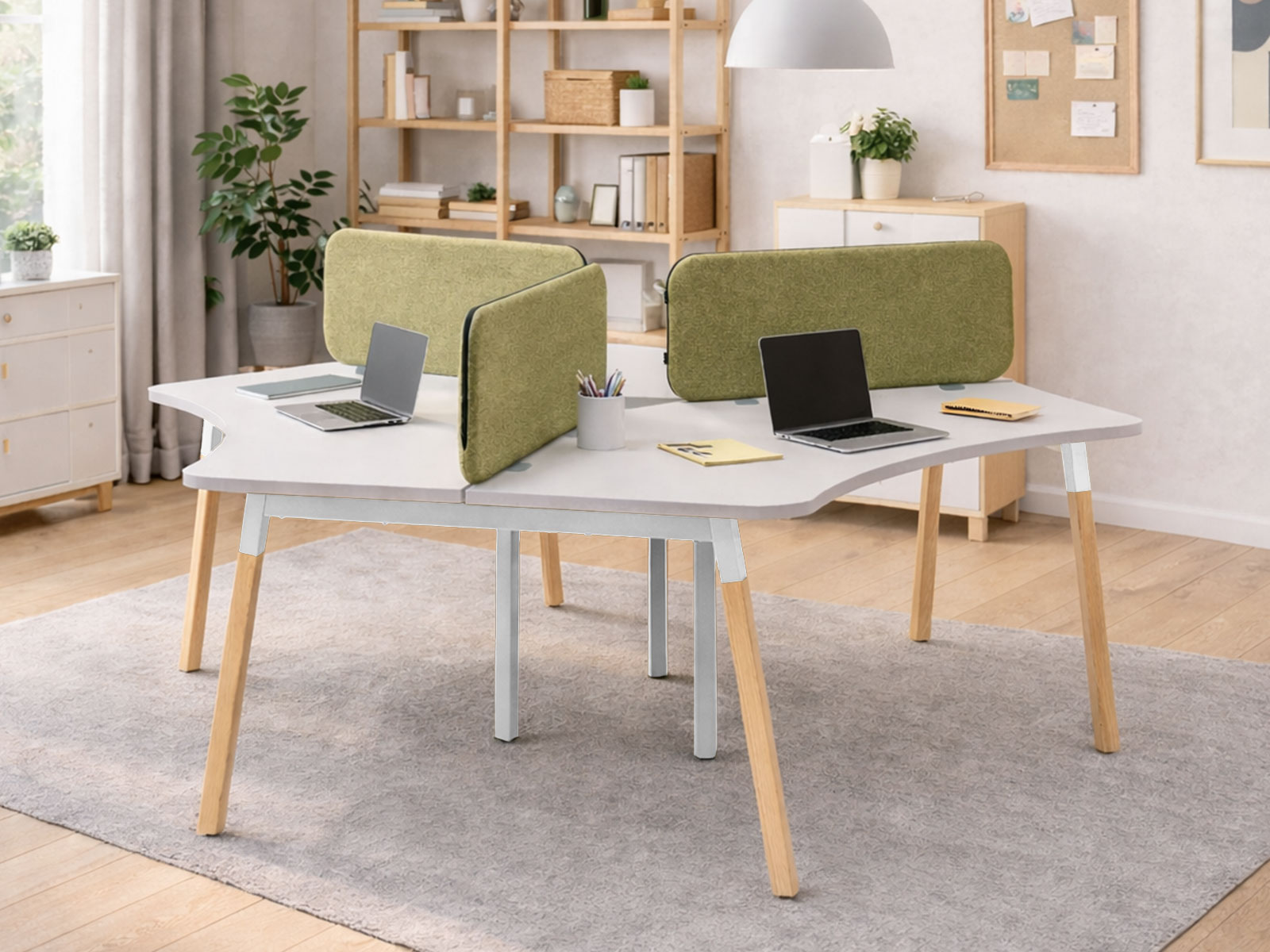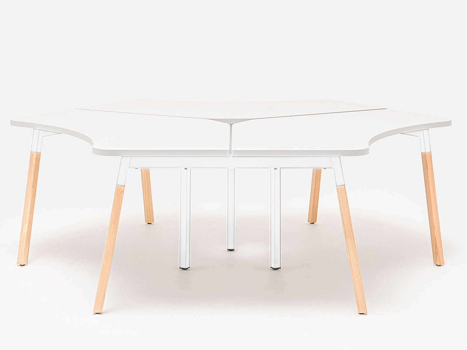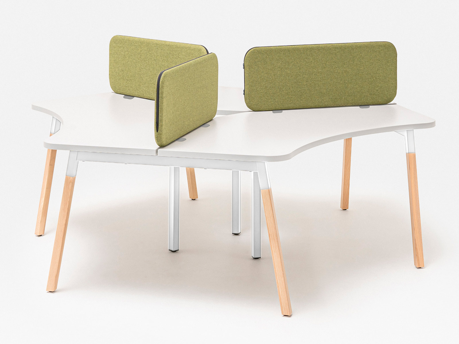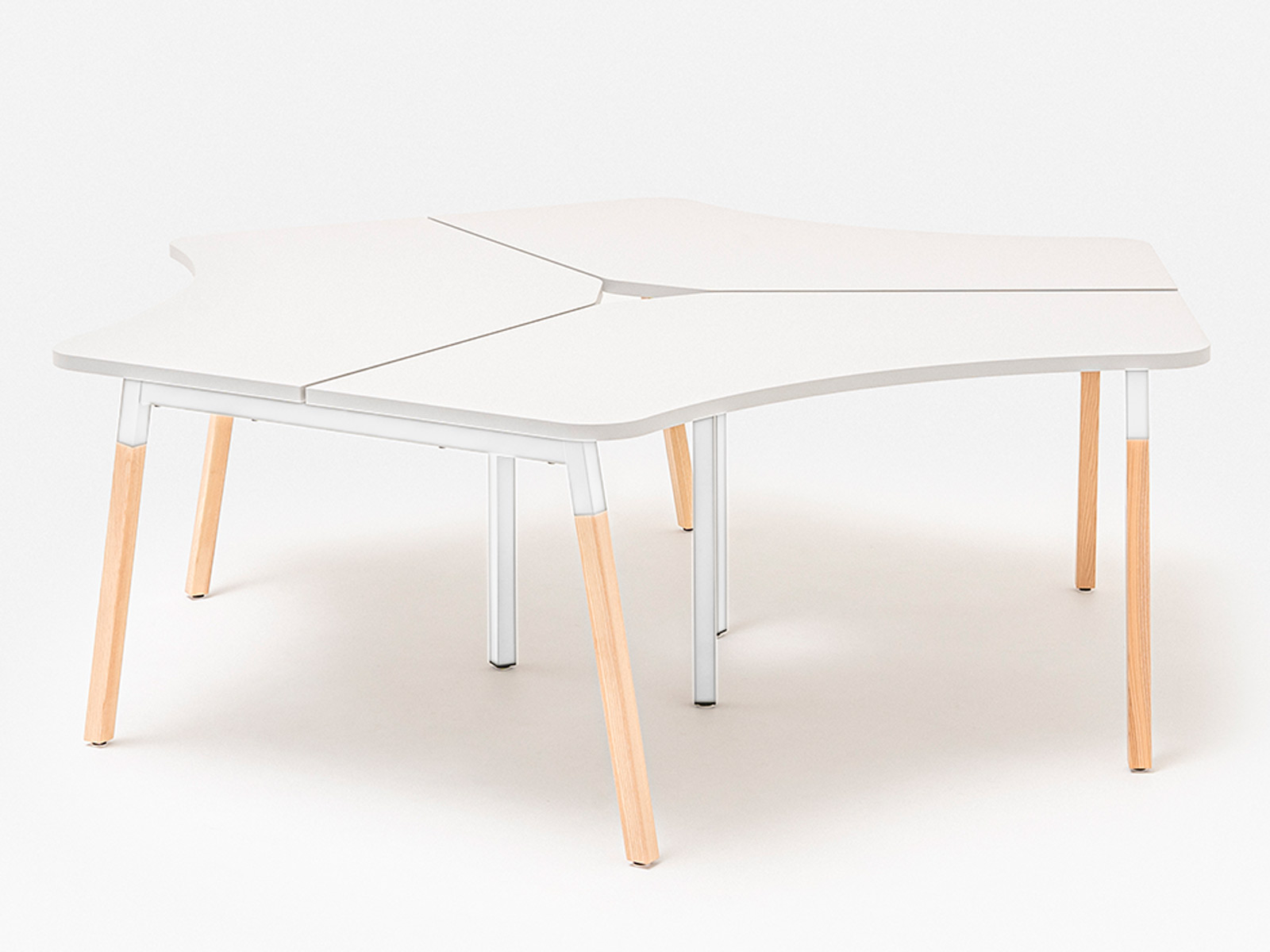 Le plateau de travail, réalisé en mélaminé de 28 mm avec des chants ABS de 2 mm, garantit un excellent rapport qualité-prix. Sa forme arrondie asymétrique optimise l’espace tout en facilitant la collaboration.
