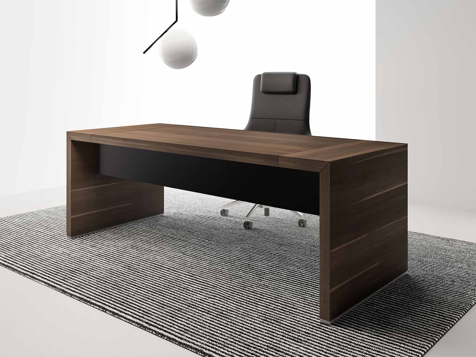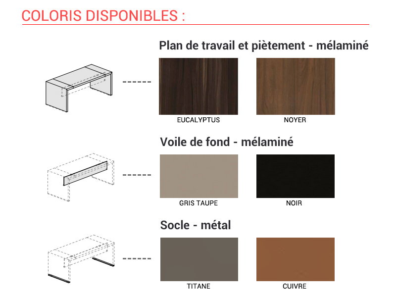Le plan de travail est proposé en 3 dimensions (180, 200 et 220 x 90 cm). La partie terminale du plateau et le piètement sont bordés et reliés par usinage à 45° avec joint soigné. Les deux panneaux latéraux et les parties extérieures du plateau présentent des veinures en opposition à l'élément central du plateau.