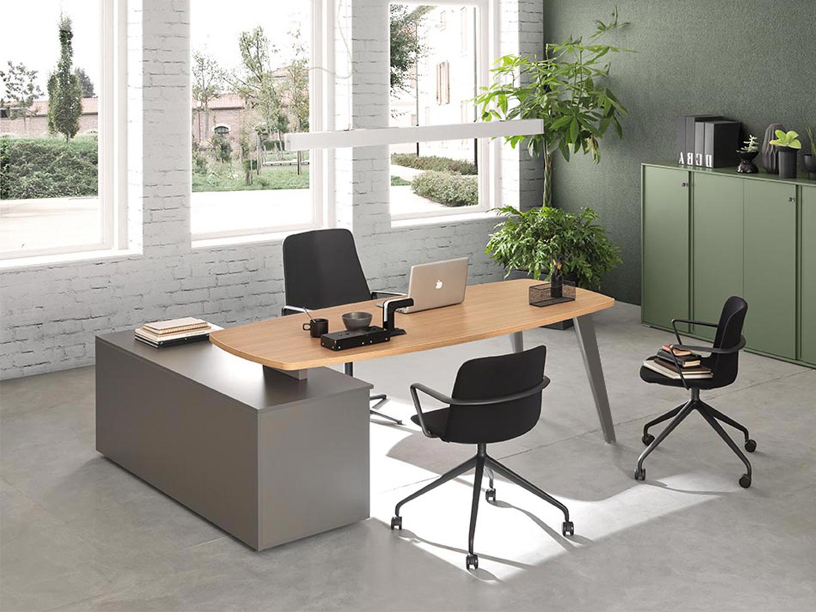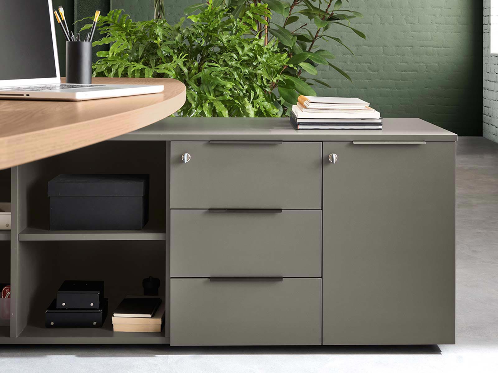 Un meuble de service viendra compléter l'ensemble, en soutien d'un côté ou de l'autre du bureau, en offrant un espace de rangement personnel conséquent. Ce dernier, d'une longueur de 164 cm et d'une profondeur de 55 cm, est composé de 4 compartiments répartis comme suit :