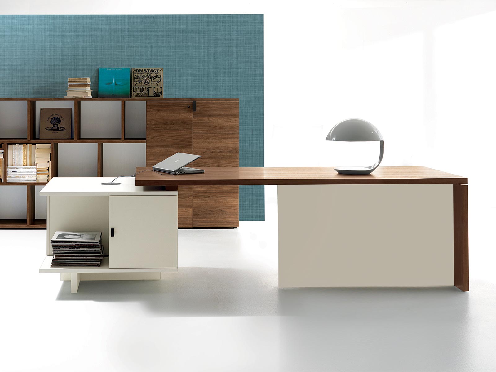 Le bureau de direction Lithos sur caisson séduit par la légèreté de sa structure, et l'originalité de sa conception. On apprécie particulièrement le contraste entre les teintes chaudes du bois (noyer naturel ou chêne foncé) et le blanc. La flexibilité de la disposition du caisson et la richesse d'aménagement de ses rangements rendent ce bureau très convaincant sur le plan fonctionnel.