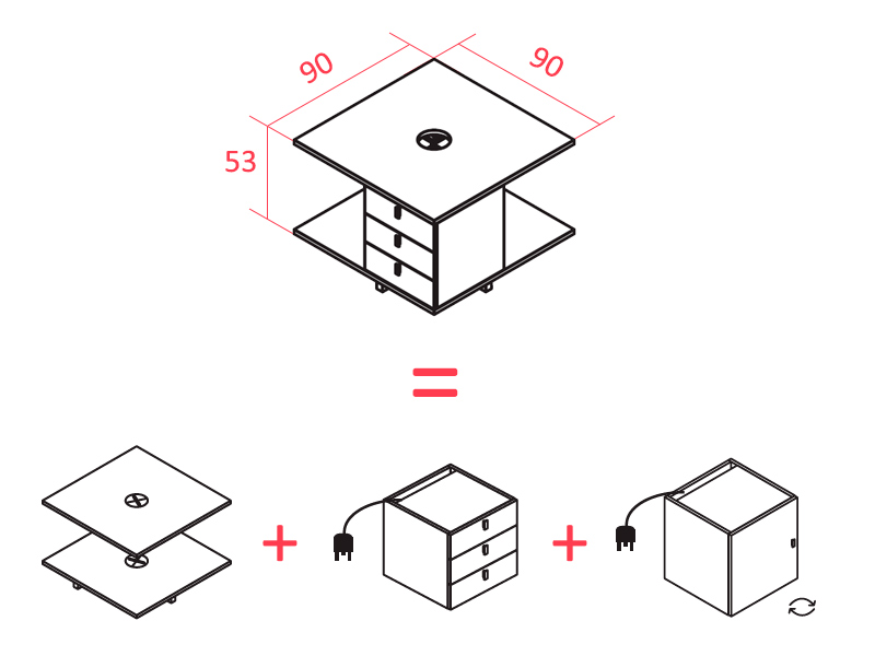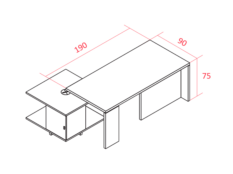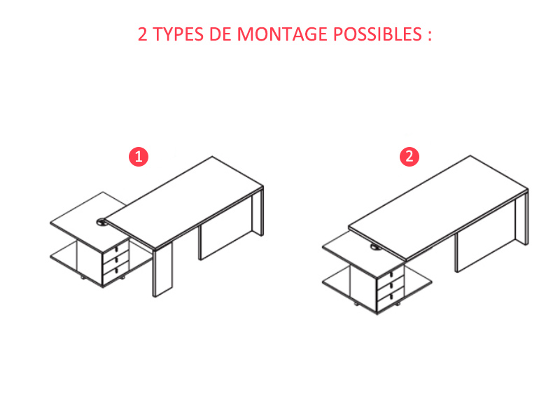 Le plateau (190 x 90 ou 220 x 90 cm) s'appuie sur un caisson carré de 90 cm côté, qui peut être aligné sous le plateau ou excentré pour avoir une partie en retour du bureau. La composition du caisson et la position des rangements peuvent être personnalisées : placards, tiroirs, niche avec grille de ventilation pour unité centrale, prennent place en fonction de vos préférences.