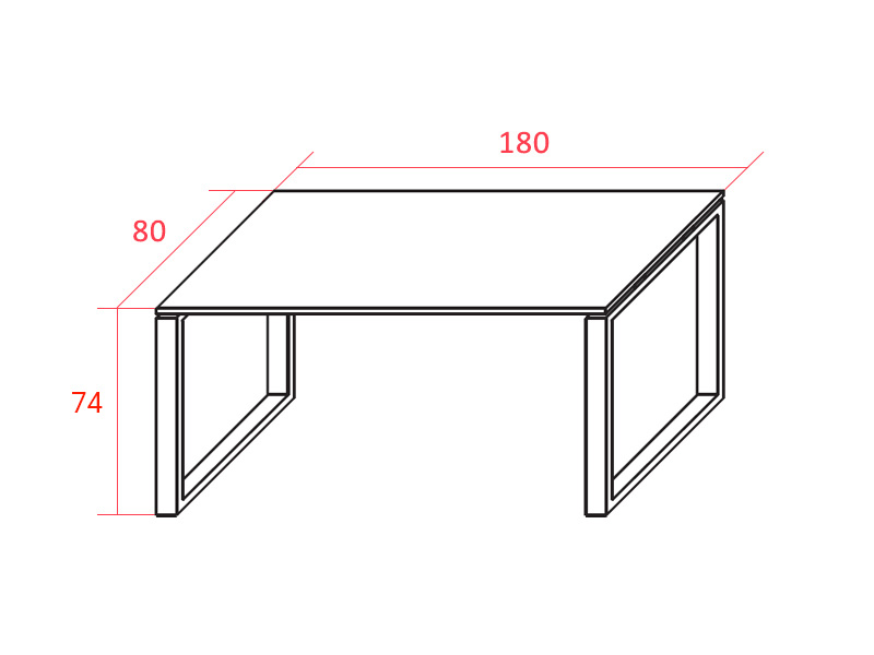Le bureau est en effet disponible en 180 ou 200 cm de longueur pour 80 ou 100 cm de profondeur. Il est équipé d'un plateau en mélaminé de 18 mm d'épaisseur (densité 620 kg/m3 classe E1 à basse émission de formaldehyde conformément aux normes ISO, classe de réaction au feu 2). Le piètement est réalisé à l'aide d'un tube en acier tréfilé ayant une section de 70 x 30 mm et 1,5 mm d'épaisseur. Il dispose également d'un niveleur ajustable d'environ 1 cm de haut.