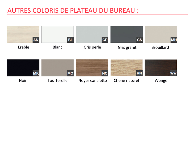 Le bureau pourra être complété d'un retour secrétaire (80 à 120 cm de long), d'un voile de fond (mélaminé ou laqué), d'une trappe passe-câbles ainsi que d'une goulotte horizontale pour la gestion de tous les fils électriques. D'autres finitions que celles proposées sont également disponibles (voir nuancier).