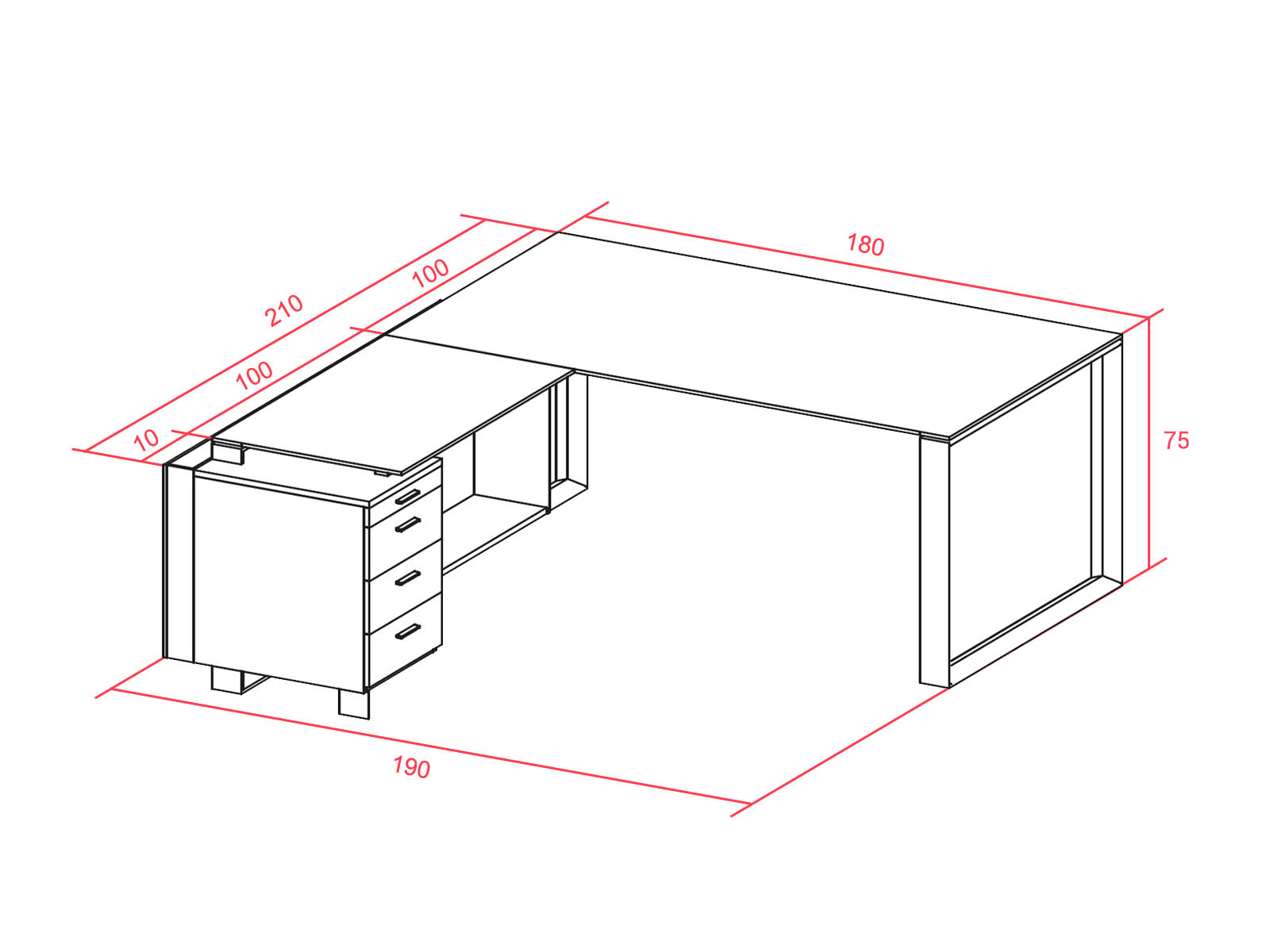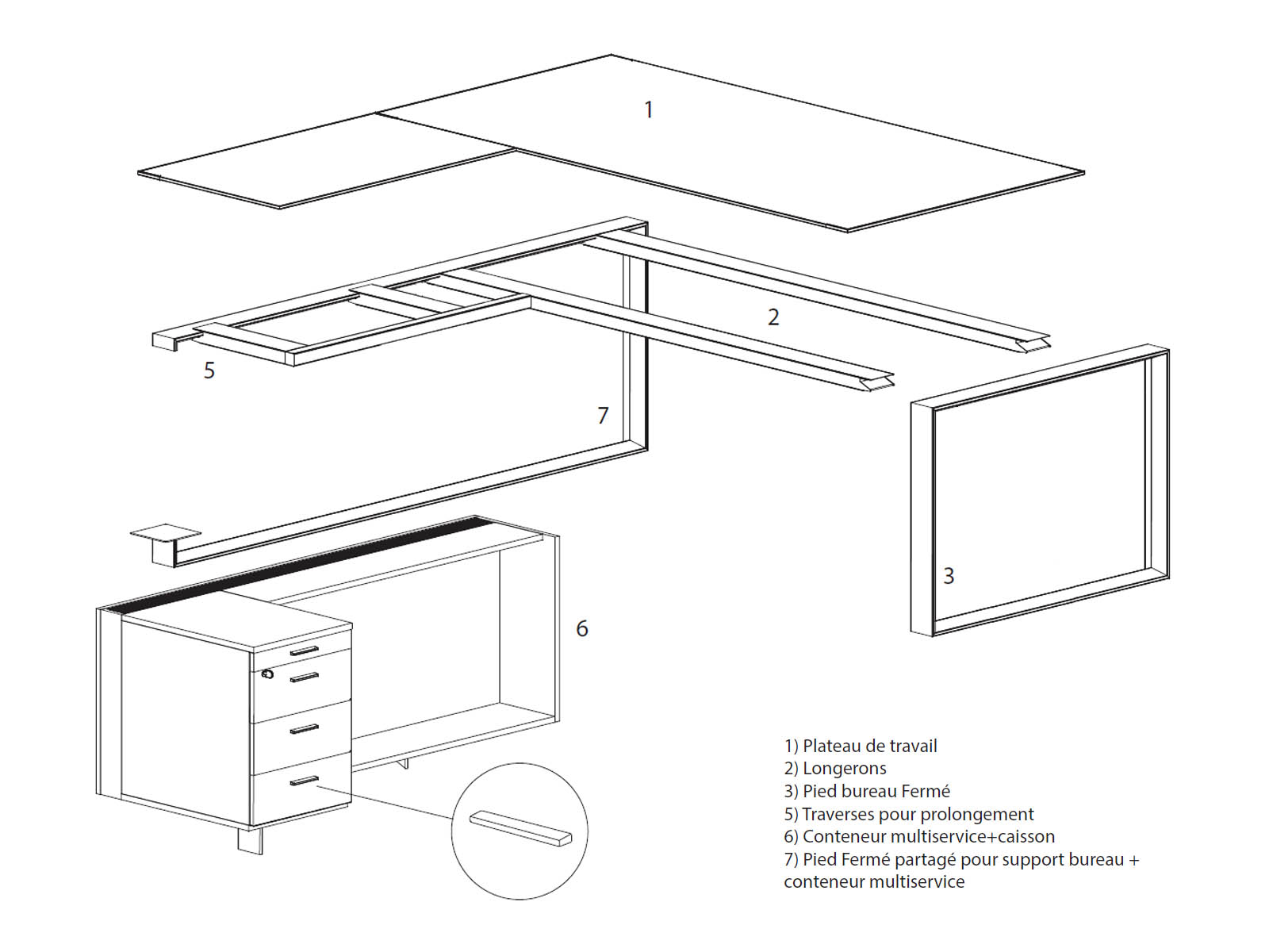 La version proposée ici a une structure chromée et intègre un retour avec caisson 3 tiroirs. Quatre finitions bois sont proposées en standard : noyer canaletto, wengé, blanc et orme.